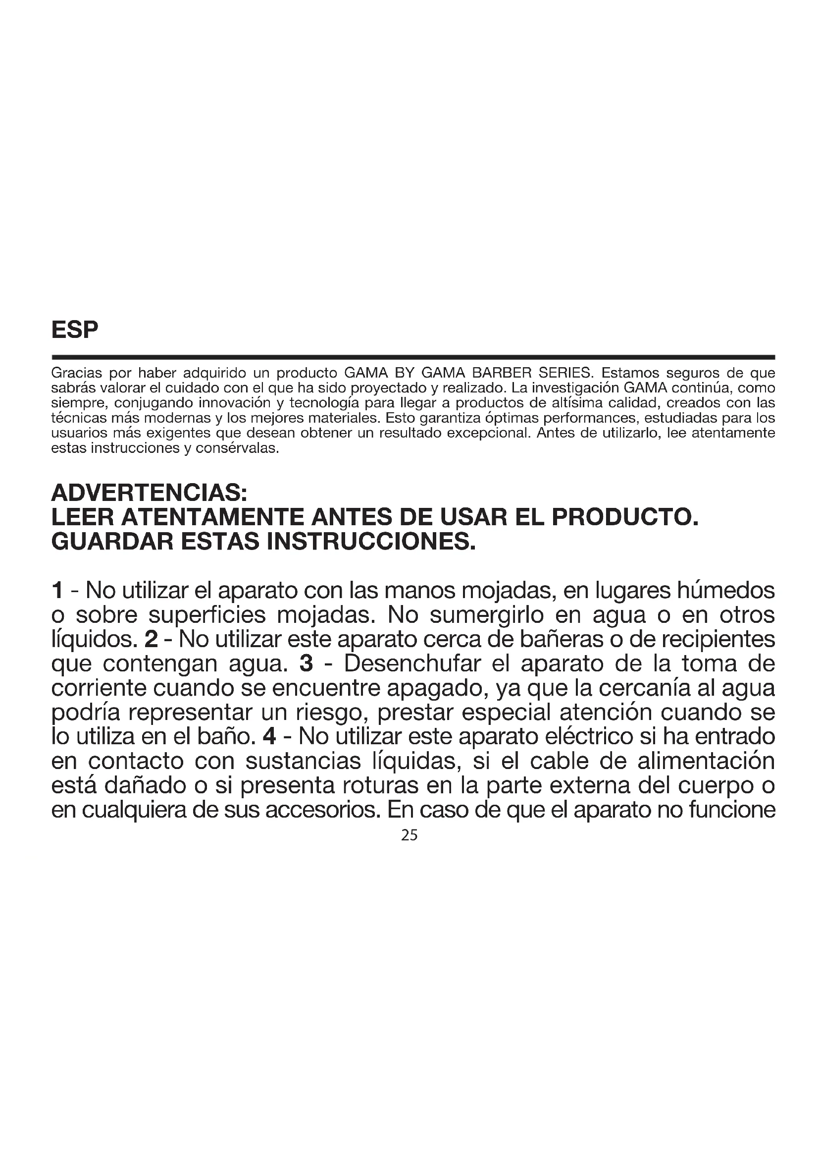 - Para apagar el cortapelos utilizar el botón . INSERCIÓN DE LOS PEINES: Los peines incluidos poseen dos muescas para su encastre. Una cerca de los dientes del peine (Fig.1), y la otra cerca de su base (Fig.2). Para insertar los peines en el cortapelos, es necesario apoyar la base de encastre cercana a los dientes del peine sobre la cuchilla del cortapelos y luego empujar la base del peine contra la base del cabezal de la cuchilla hasta sentir un leve chasquido: la inserción se habrá completado. Para remover el peine, es suficiente con tirar de la lengüeta que se encuentra en la base del peine, haciendo fuerza hacia el exterior. REGULACIÓN DEL CORTE: ABSOLUTE PRO CUT ofrece la posibilidad de efectuar acabados, si se lo utiliza sin peine guía y valiéndose del regulador de la cuchilla presente en el cuerpo del aparato, con las siguientes alturas de corte: 0,3 mm, 1,05 mm, 1,8 mm, 2,55 mm y 3,3 mm. En cambio, utilizando los 4 peines guía incluidos será posible efectuar el clásico corte de pelo con los siguientes largos: 3 mm, 6 mm, 9 mm y 12 mm. FUNCIÓN CORD-CORDLESS: Esta función permite utilizar el cortapelos con o sin cable. Si el aparato no posee la suficiente carga para su uso, podrá ser conectado directamente a la toma de corriente sin interrumpir el corte en ejecución. LIMPIEZA Y MANTENIMIENTO: Un cortapelos limpio y bien lubricado mejora notablemente su capacidad y precisión de corte. NO LIMPIAR NINGUNA PARTE DEL APARATO BAJO EL AGUA CORRIENTE. (Fig.2)(Fig.1)PL Dziękujemy za zakup produktu GAMA BY GAMA BARBER SERIES. Jesteśmy pewni, że nasi klienci docenią dbałość, z jaką go zaprojektowaliśmy i stworzyliśmy. Rozwiązania firmy GAMA. od zawsze łączą w sobie innowacyjność i technologię, umożliwiając opracowanie produktów najwyższej jakości, stworzonych przy użyciu najnowocześniejszych metod i najlepszych materiałów. Dzięki temu zapewniają one optymalną wydaj- ność, zadowalającą nawet najbardziej wymagających użytkowników, którzy oczekują doskonałych rezultatów zarówno w salonie, jak i we własnym domu. Przed użyciem należy uważnie przeczytać instrukcję obsługi i zachować ją. ZASADY BEZPIECZEŃSTWA:
