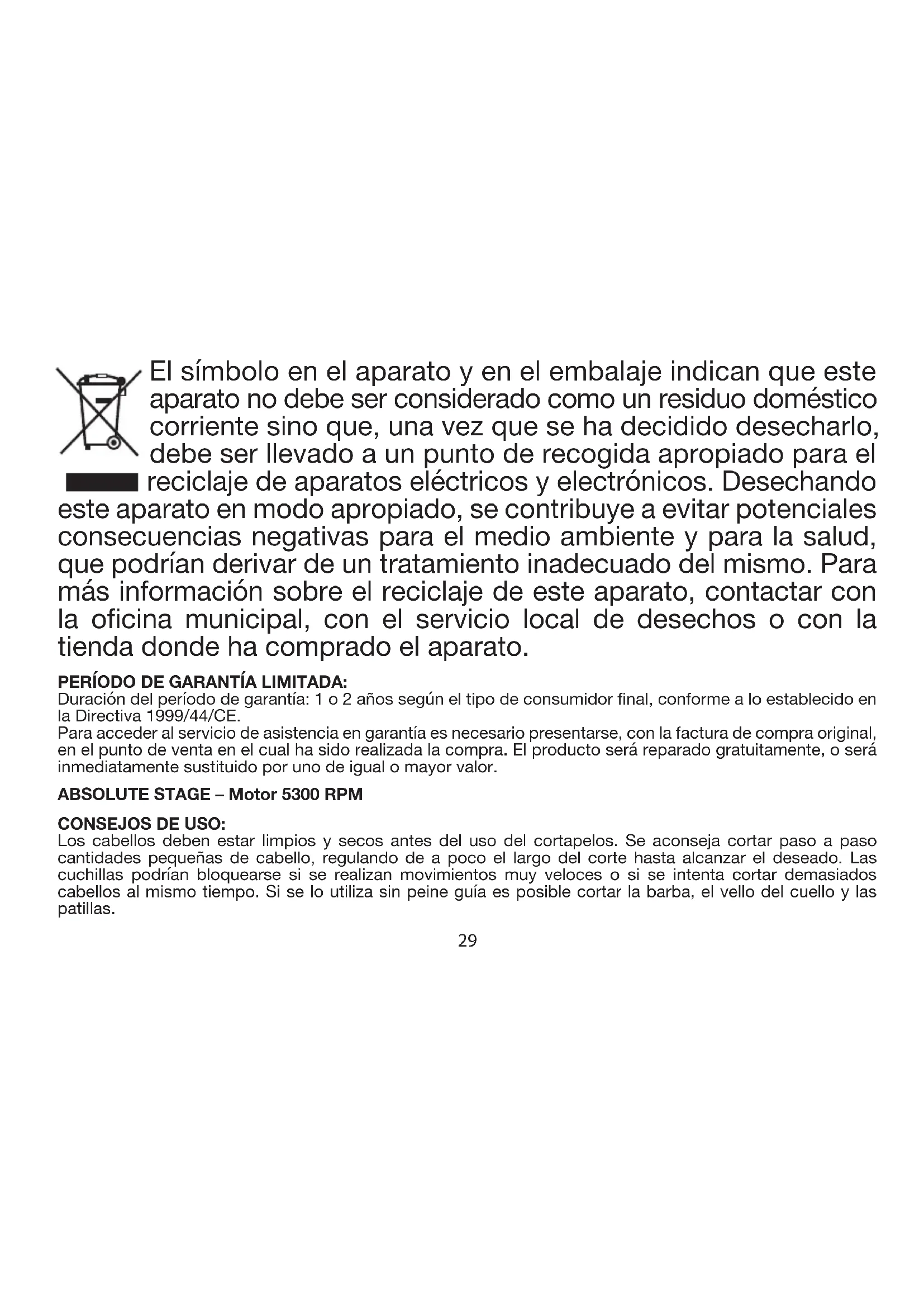lub na mokrych powierzchniach. Nie zanurzać w wodzie ani innych cieczach. 2. Nie używać urządzenia w pobliżu wanien kąpielowych ani innych zbiorników z wodą. 3. Wyjąć wtyczkę z urządzenia, jeśli jest ono wyłączone, ponieważ bliskość wody może stanowić zagrożenie. Zachować szczególną ostrożność podczas używania urządzenia w łazience. 4. Nie używać przedmiotowego urządzenia elektrycznego, jeśli w przeszłości miało ono kontakt z cieczami, El símbolo en el aparato y en el embalaje indican que este aparato no debe ser considerado como un residuo doméstico corriente sino que, una vez que se ha decidido desecharlo, debe ser llevado a un punto de recogida apropiado para el reciclaje de aparatos eléctricos y electrónicos. Desechando este aparato en modo apropiado, se contribuye a evitar potenciales consecuencias negativas para el medio ambiente y para la salud, que podrían derivar de un tratamiento inadecuado del mismo. Para más información sobre el reciclaje de este aparato, contactar con la oficina municipal, con el servicio local de desechos o con la tienda donde ha comprado el aparato. PERÍODO DE GARANTÍA LIMITADA: Duración del período de garantía: 1 o 2 años según el tipo de consumidor final, conforme a lo establecido en la Directiva 1999/44/CE. Para acceder al servicio de asistencia en garantía es necesario presentarse, con la factura de compra original, en el punto de venta en el cual ha sido realizada la compra. El producto será reparado gratuitamente, o será inmediatamente sustituido por uno de igual o mayor valor. ABSOLUTE STAGE – Motor 5300 RPM CONSEJOS DE USO: Los cabellos deben estar limpios y secos antes del uso del cortapelos. Se aconseja cortar paso a paso cantidades pequeñas de cabello, regulando de a poco el largo del corte hasta alcanzar el deseado. Las cuchillas podrían bloquearse si se realizan movimientos muy veloces o si se intenta cortar demasiados cabellos al mismo tiempo. Si se lo utiliza sin peine guía es posible cortar la barba, el vello del cuello y las patillas. 29ANTES DEL USO: Antes de recargar el cortapelos por primera vez se aconseja descargar por completo la batería para luego proceder a la carga completa.