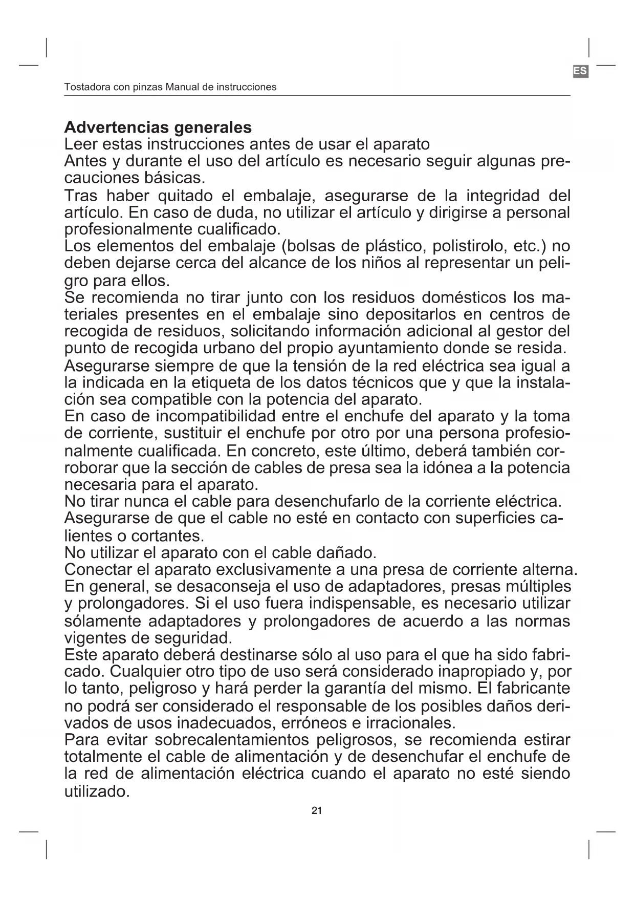 Advertencias generales Leer estas instrucciones antes de usar el aparato Antes y durante el uso del artículo es necesario seguir algunas pre- cauciones básicas. Tras haber quitado el embalaje, asegurarse de la integridad del artículo. En caso de duda, no utilizar el artículo y dirigirse a personal profesionalmente cualicado. Los elementos del embalaje (bolsas de plástico, polistirolo, etc.) no deben dejarse cerca del alcance de los niños al representar un peli- gro para ellos. Se recomienda no tirar junto con los residuos domésticos los ma- teriales presentes en el embalaje sino depositarlos en centros de recogida de residuos, solicitando información adicional al gestor del punto de recogida urbano del propio ayuntamiento donde se resida. Asegurarse siempre de que la tensión de la red eléctrica sea igual a la indicada en la etiqueta de los datos técnicos que y que la instala- ción sea compatible con la potencia del aparato. En caso de incompatibilidad entre el enchufe del aparato y la toma de corriente, sustituir el enchufe por otro por una persona profesio- nalmente cualicada. En concreto, este último, deberá también cor- roborar que la sección de cables de presa sea la idónea a la potencia necesaria para el aparato. No tirar nunca el cable para desenchufarlo de la corriente eléctrica. Asegurarse de que el cable no esté en contacto con supercies ca- lientes o cortantes. No utilizar el aparato con el cable dañado. Conectar el aparato exclusivamente a una presa de corriente alterna. En general, se desaconseja el uso de adaptadores, presas múltiples y prolongadores. Si el uso fuera indispensable, es necesario utilizar sólamente adaptadores y prolongadores de acuerdo a las normas vigentes de seguridad. Este aparato deberá destinarse sólo al uso para el que ha sido fabri- cado. Cualquier otro tipo de uso será considerado inapropiado y, por lo tanto, peligroso y hará perder la garantía del mismo. El fabricante no podrá ser considerado el responsable de los posibles daños deri- vados de usos inadecuados, erróneos e irracionales. Para evitar sobrecalentamientos peligrosos, se recomienda estirar totalmente el cable de alimentación y de desenchufar el enchufe de la red de alimentación eléctrica cuando el aparato no esté siendo utilizado.Tostadora con pinzas Manual de instrucciones