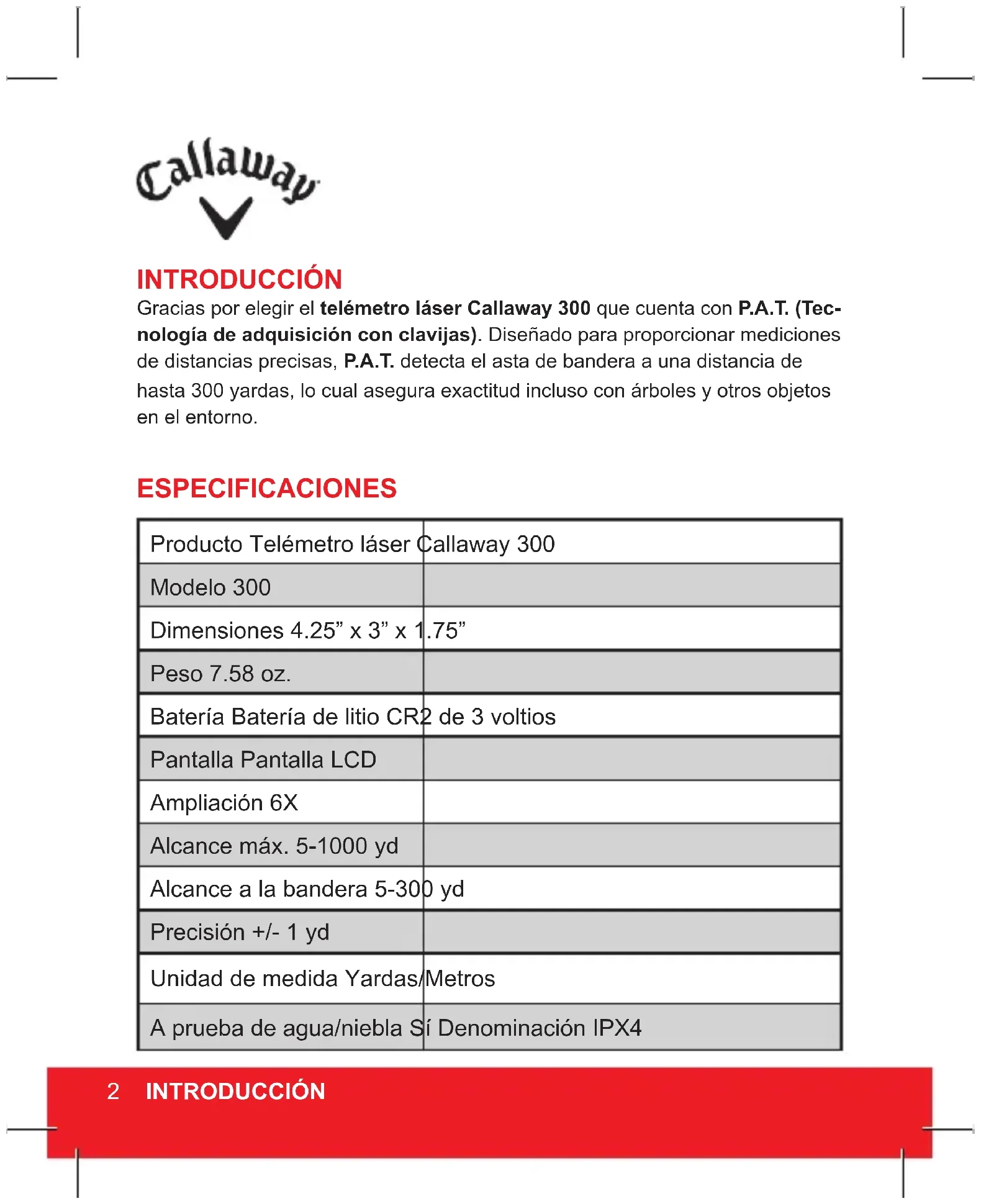 - NE PAS ranger le télémètre laser à des températures extrêmes chaudes/ froides (<50°F - >110° F). © 2015 CALLAWAY GOLF COMPANY. Callaway Golf et les ap- pareils Chevron sont des marques de commerce de Callaway Golf Company. IZZO Golf est une licence de Callaway Golf Company.TELÉMETRO LÁSER 300 ESPAÑOL 1Producto Telémetro láser Callaway 300 Modelo 300 Dimensiones 4.25” x 3” x 1.75” Peso 7.58 oz. Batería Batería de litio CR2 de 3 voltios Pantalla Pantalla LCD Ampliación 6X Alcance máx. 5-1000 yd Alcance a la bandera 5-300 yd Precisión +/- 1 yd Unidad de medida Yardas/Metros A prueba de agua/niebla Sí Denominación IPX4 ESPECIFICACIONES INTRODUCCIÓN Gracias por elegir el telémetro láser Callaway 300 que cuenta con P.A.T. (Tec- nología de adquisición con clavijas). Diseñado para proporcionar mediciones de distancias precisas, P.A.T. detecta el asta de bandera a una distancia de hasta 300 yardas, lo cual asegura exactitud incluso con árboles y otros objetos en el entorno. 2 INTRODUCCIÓNINSTALACIÓN DE LA BATERÍA El Callaway 300 usa una batería de litio CR2 de 3 voltios reemplazable. Para instalarla, retire la tapa de la batería que se encuentra debajo de la lente. Inserte primero el extremo negativo (plano) de la batería y cierre la tapa de la batería.