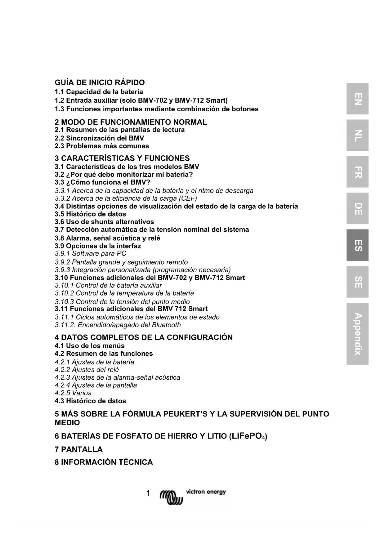 tienen un mejor rendimiento que las baterías de plomo-ácido. A menos que el fabricante de la batería indique lo contrario, recomendamos establecer el exponente Peukert en 1,05. Advertencia importante Las baterías de Li-ion son caras y pueden sufrir daños irreparables debido a una descarga o carga excesivas. Pueden producirse daños debido a una descarga excesiva si las pequeñas cargas (como por ejemplo, sistemas de alarmas, relés, corriente de espera de ciertas cargas, drenaje de corriente por parte de los cargadores de batería o reguladores de carga) descargan lentamente la batería cuando el sistema no está en uso. En caso de cualquier duda sobre el posible consumo de corriente residual, aísle la batería abriendo el interruptor de la batería, quitando el fusible o fusibles de la batería o desconectando el positivo de la batería, cuando el sistema no esté en uso. La corriente de descarga residual es especialmente peligrosa si el sistema se ha descargado por completo y se ha producido una desconexión por baja tensión en las celdas. Después de la desconexión producida por baja tensión en las celdas, aún queda en una batería Li-Ion una reserva de 1 Ah por cada 100 Ah de capacidad aproximadamente. La batería quedará dañada si se extrae la reserva de capacidad que queda en la batería. Una corriente residual de 4 mA, por ejemplo, puede dañar una batería de 100 Ah si el sistema se deja en estado de descarga durante más de 10 días (4 mA x 24 h x 10 días = 0,96 Ah). Un BMV 700 ó 702 consume 4 mA de una batería de 12 V (que aumenta a 15 mA si se alimenta el relé). Por lo tanto, el suministro positivo debe interrumpirse si un sistema con baterías Li-Ion se deja desatendido durante un periodo de tiempo lo suficientemente largo como para que el BMV descargue completamente la batería. Recomendamos encarecidamente el uso del BMV-712 Smart, con un consumo de corriente de sólo 1 mA (batería de 12 V), sin importar la posición del relé de alarma.41 NL FR DE ES SE IT PT EN NL FR DE ES SE Appendix 7 PANTALLA Resumen de la pantalla del BMV
