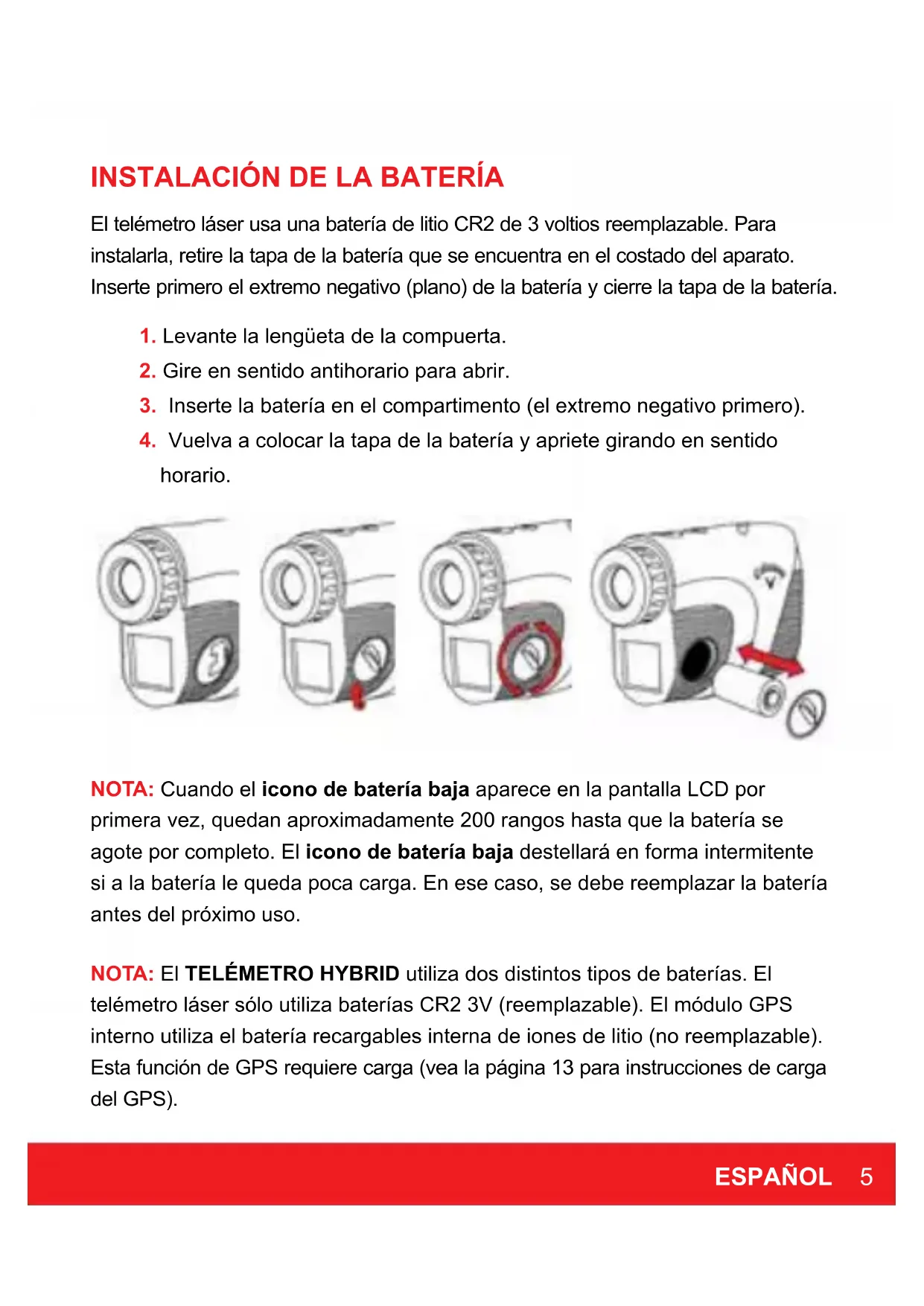 horario. NOTA: Cuando el icono de batería baja aparece en la pantalla LCD por primera vez, quedan aproximadamente 200 rangos hasta que la batería se agote por completo. El icono de batería baja destellará en forma intermitente si a la batería le queda poca carga. En ese caso, se debe reemplazar la batería antes del próximo uso. NOTA: El TELÉMETRO HYBRID utiliza dos distintos tipos de baterías. El telémetro láser sólo utiliza baterías CR2 3V (reemplazable). El módulo GPS interno utiliza el batería recargables interna de iones de litio (no reemplazable). Esta función de GPS requiere carga (vea la página 13 para instrucciones de carga del GPS).