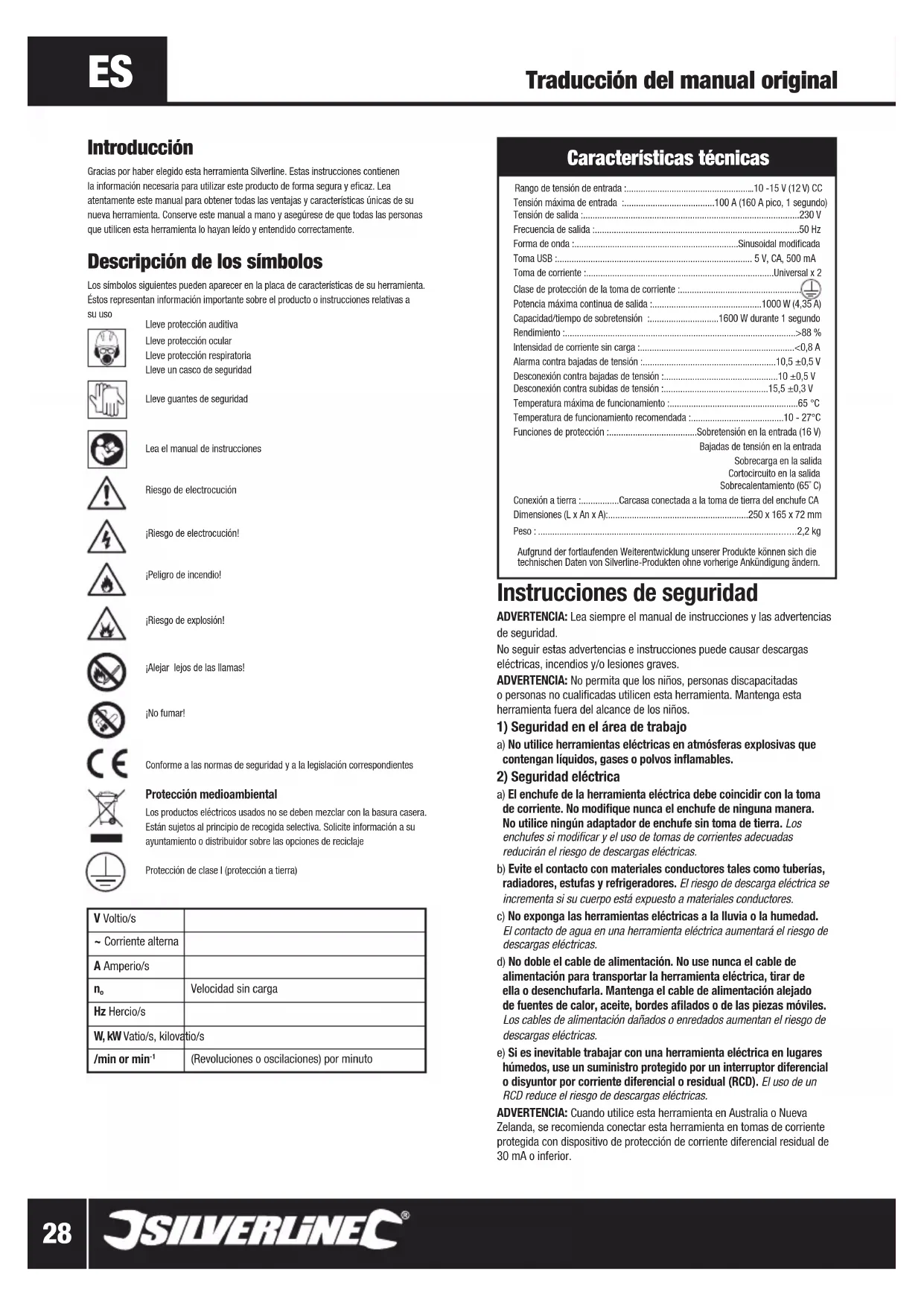Velocidad sin cargaHz Hercio/sW, kW Vatio/s, kilovatio/s/min or min (Revoluciones o oscilaciones) por minuto Características técnicas Rango de tensión de entrada :......................................................10 -15 V (12 V) CC Tensión máxima de entrada :......................................100 A (160 A pico, 1 segundo)Tensión de salida :...........................................................................................230 V Frecuencia de salida :......................................................................................50 HzForma de onda :.....................................................................Sinusoidal modificadaToma USB :.................................................................................. 5 V, CA, 500 mAToma de corriente :...............................................................................Universal x 2Clase de protección de la toma de corriente :................................................... Potencia máxima continua de salida :..............................................1000 W (4,35 A) Capacidad/tiempo de sobretensión :.............................1600 W durante 1 segundo Rendimiento :.................................................................................................>88 %Intensidad de corriente sin carga :.................................................................<0,8 AAlarma contra bajadas de tensión :........................................................10,5 ±0,5 V Desconexión contra bajadas de tensión :................................................10 ±0,5 VDesconexión contra subidas de tensión :............................................15,5 ±0,3 VTemperatura máxima de funcionamiento :......................................................65 °CTemperatura de funcionamiento recomendada :.......................................10 - 27°C Funciones de protección :.....................................Sobretensión en la entrada (16 V)Bajadas de tensión en la entrada Sobrecarga en la salidaCortocircuito en la salidaSobrecalentamiento (65˚ C)Conexión a tierra :................Carcasa conectada a la toma de tierra del enchufe CADimensiones (L x An x A):...........................................................250 x 165 x 72 mm Peso : ............................................................................................................2,2 kg Aufgrund der fortlaufenden Weiterentwicklung unserer Produkte können sich die technischen Daten von Silverline-Produkten ohne vorherige Ankündigung ändern. Instrucciones de seguridad ADVERTENCIA: Lea siempre el manual de instrucciones y las advertencias de seguridad. No seguir estas advertencias e instrucciones puede causar descargas eléctricas, incendios y/o lesiones graves.ADVERTENCIA: No permita que los niños, personas discapacitadas o personas no cualificadas utilicen esta herramienta. Mantenga esta herramienta fuera del alcance de los niños.