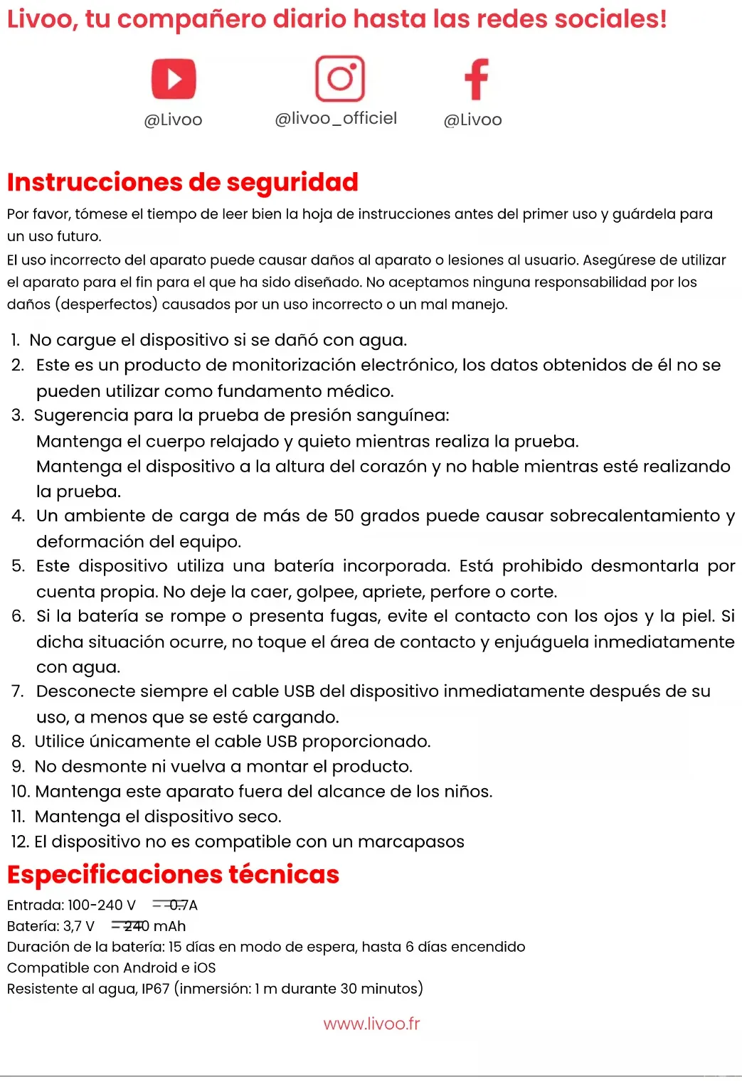 Especificaciones técnicas Entrada: 100-240 V 0.7A Batería: 3,7 V 240 mAh Duración de la batería: 15 días en modo de espera, hasta 6 días encendido Compatible con Android e iOS Resistente al agua, IP67 (inmersión: 1 m durante 30 minutos) @livoo_officiel @Livoo @Livoowww.livoo.fr Sistemas compatibles: Android 8.0 o iOS 8.0 o superior, Bluetooth 5.0 o superior. Advertencia: Este producto no es un dispositivo médico. Los relojes y sus aplicaciones no deben utilizarse para el diagnóstico, el tratamiento o la prevención de enfermedades o afecciones. Para cambiar sus hábitos, por ejemplo, de ejercicio y sueño, asegúrese de consultar a un profesional médico calificado para evitar lesiones graves. Nos reservamos el derecho de modificar y mejorar cualquiera de las funciones descritas en este manual sin previo aviso y de actualizar continuamente el contenido del producto. Todos los contenidos están sujetos al producto real. Deje de usar la pulsera inteligente en caso de alergia en la piel o cualquier molestia. Ajuste la tensión de la pulsera inteligente para asegurar la circulación de aire. Uso del dispositivo Carga del dispositivo (Figura 1). Cargue completamente el dispositivo antes de su primer uso. Enchufe la línea magnética del cable USB y conecte el puerto USB del cable de carga a otro dispositivo que pueda cargar el dispositivo. Cuando se conecta correctamente, la pantalla indica que la carga está en curso. No se puede utilizar el dispositivo durante el proceso de carga. Tenga en cuenta el voltaje máximo de carga del dispositivo (5 V) para evitar dañarlo. Descarga y emparejamiento (Figura 2) Para encender su reloj inteligente, mantenga pulsado el botón lateral durante 3 segundos. Descargue e instale la aplicación JYouPro, a través del código QR indicado en este documento o buscando la aplicación directamente en AppStore o Google Play. También puede obtener el código QR de la aplicación directamente en el reloj, en el menú Ajustes > Descargar aplicación. Emparejamiento (Figuras 3, 4 y 5) Una vez que haya descargado e instalado la aplicación en su dispositivo móvil, siga las instrucciones en la aplicación para configurarla como prefiera, de acuerdo a su información personal. Active Bluetooth en su dispositivo móvil. En la aplicación, haga clic en el menú "dispositivo". En este menú, pulse "conectar con código QR". Se mostrarán todos los dispositivos Bluetooth accesibles. Seleccione el dispositivo TEC619 de esa lista. Nota: Los dispositivos Bluetooth solo se pueden emparejar de forma individual, por lo tanto, asegúrese de desconectar cualquier dispositivo Bluetooth anterior cuando conecte un dispositivo nuevo. Cambio de las interfaces del menú de la pantalla principal (Figuras 5 y 6). Una vez que haya emparejado el reloj y su dispositivo, la hora y la fecha de su móvil se sincronizarán con el reloj (Figura 6). Para cambiar el fondo de pantalla del reloj, mantenga pulsada la pantalla durante 4 segundos. Luego, pulse en el fondo de pantalla que prefiera de todos los propuestos. Nota: a través de la aplicación, también puede cargar fondos de pantalla nuevos en el reloj utilizando los menús "Fondo de pantalla personalizado" o "Ajustes de la esfera". Desvinculación del dispositivo (Figura 7) En cualquier momento, puede desvincular el reloj y su dispositivo a través de la aplicación haciendo clic en "Desconectar dispositivo". Navegación por el menú con el relojwww.livoo.fr Después de unos segundos sin uso, la pantalla del reloj se apagará. Puede encenderla pulsando el botón lateral del reloj. Una vez encendida la pantalla, deslícela para acceder a las diferentes interfaces. Puede regresar a la pantalla anterior pulsando el botón lateral del reloj.