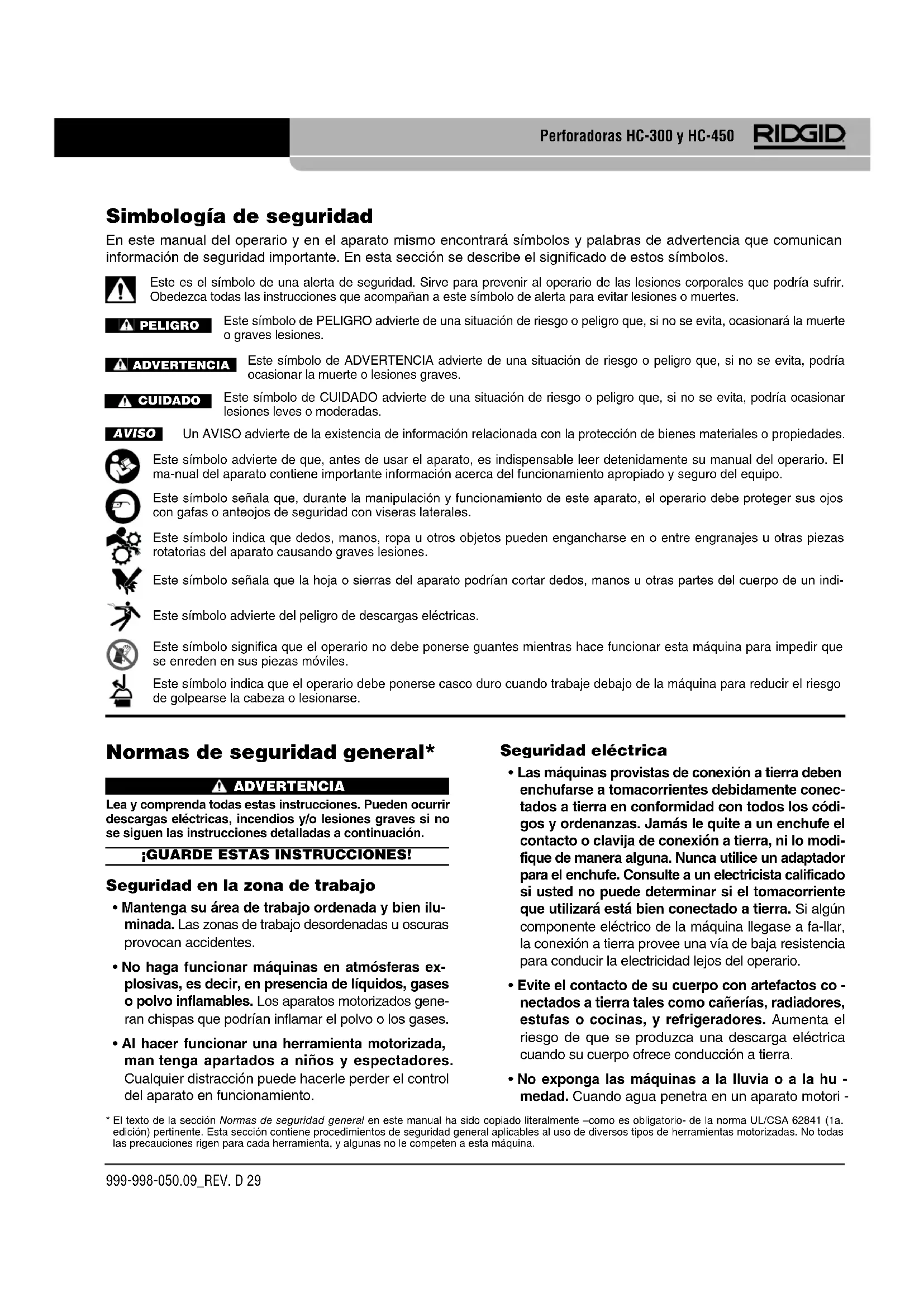 - El texto de la sección Normas de seguridad general en este manual ha sido copiado literalmente –como es obligatorio- de la norma UL/CSA 62841 (1a. edición) pertinente. Esta sección contiene procedimientos de seguridad general aplicables al uso de diversos tipos de herramientas motorizadas. No todas las precauciones rigen para cada herramienta, y algunas no le competen a esta máquina.999-998-050.09_REV. D30 Perforadoras HC-300 y HC-450 zado, aumenta el riesgo de que se produzcan descar- gas eléctricas.