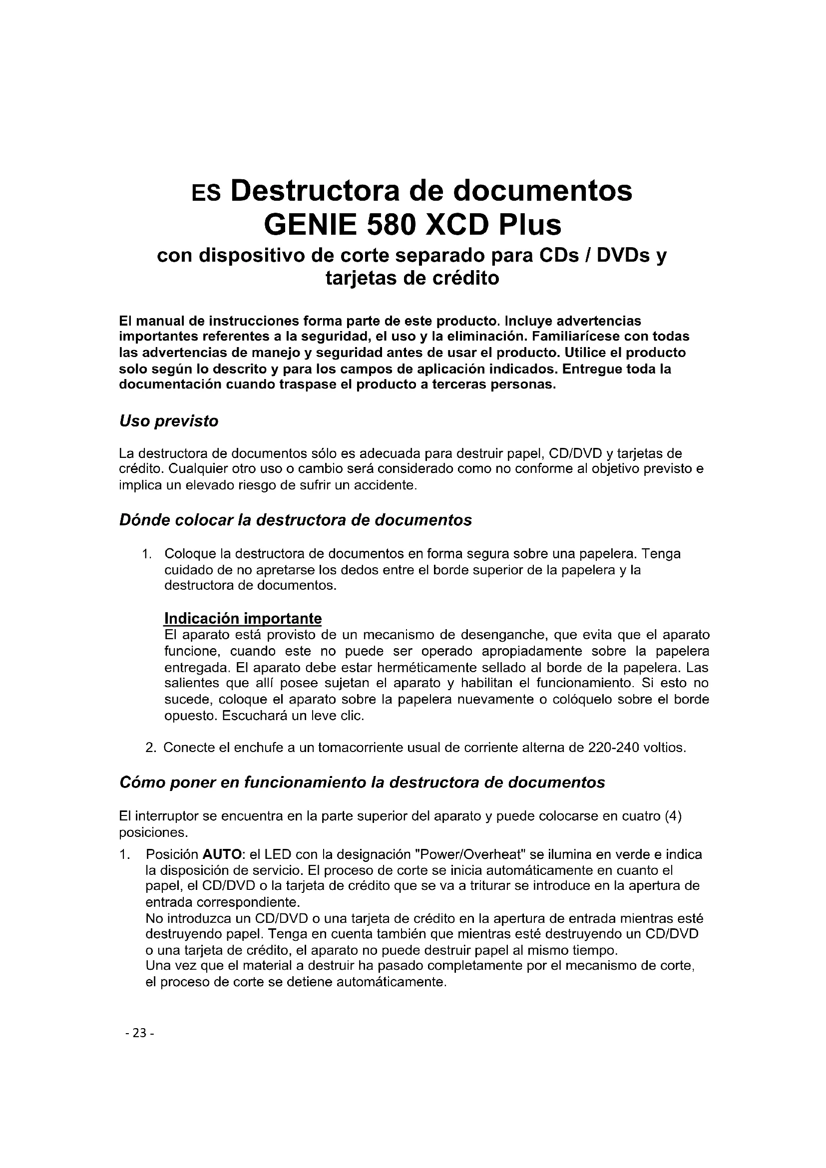 Fabricant GO Europe GmbH Zum Kraftwerk 1 D-45527 Hattingen Allemagne www.go-europe.com service@go-europe.com Déclaration de conformité La conformité est attestée sur l'appareil par le marquage CE. Vous trouverez la déclaration de conformité de ce produit sur le site www.go-europe.com.- 23 - ES Destructora de documentos GENIE 580 XCD Plus con dispositivo de corte separado para CDs / DVDs y tarjetas de crédito El manual de instrucciones forma parte de este producto. Incluye advertencias importantes referentes a la seguridad, el uso y la eliminación. Familiarícese con todas las advertencias de manejo y seguridad antes de usar el producto. Utilice el producto solo según lo descrito y para los campos de aplicación indicados. Entregue toda la documentación cuando traspase el producto a terceras personas.