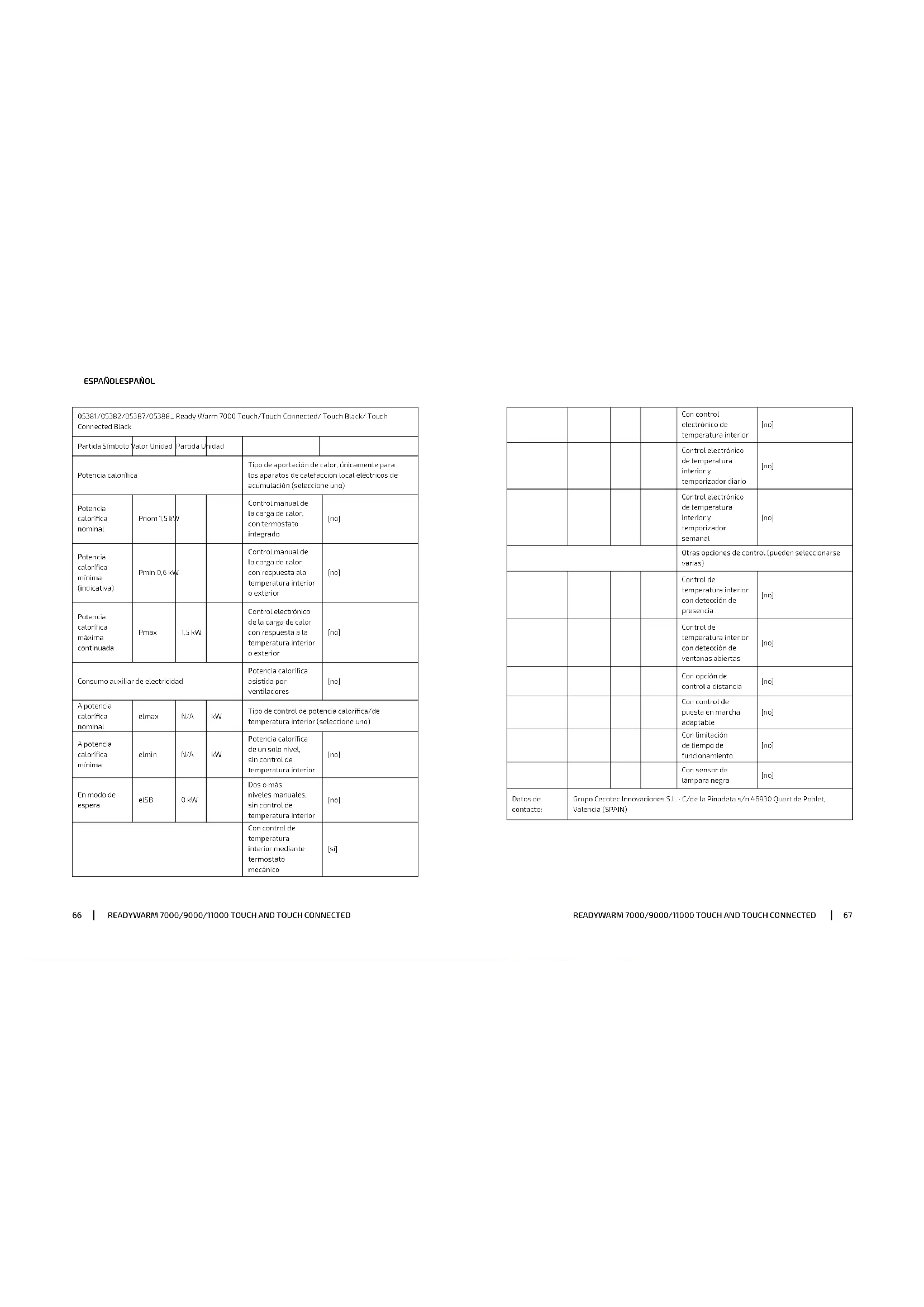 05381/05382/05387/05388_ Ready Warm 7000 Touch/Touch Connected/ Touch Black/ Touch Connected Black Partida Símbolo Valor Unidad Partida Unidad Potencia caloríca Tipo de aportación de calor, únicamente para los aparatos de calefacción local eléctricos de acumulación (seleccione uno) Potencia caloríca nominal Pnom 1,5 kW Control manual de la carga de calor, con termostato integrado [no] Potencia caloríca mínima (indicativa) Pmin 0,6 kW Control manual de la carga de calor con respuesta ala temperatura interior o exterior [no] Potencia caloríca máxima continuada Pmax 1,5 kW Control electrónico de la carga de calor con respuesta a la temperatura interior o exterior [no] Consumo auxiliar de electricidad Potencia caloríca asistida por ventiladores [no] A potencia caloríca nominal elmax N/A kW Tipo de control de potencia caloríca/de temperatura interior (seleccione uno) A potencia caloríca mínima elmin N/A kW Potencia caloríca de un solo nivel, sin control de temperatura interior [no] En modo de espera elSB 0 kW Dos o más niveles manuales, sin control de temperatura interior [no] Con control de temperatura interior mediante termostato mecánico [sí] Con control electrónico de temperatura interior [no] Control electrónico de temperatura interior y temporizador diario [no] Control electrónico de temperatura interior y temporizador semanal [no] Otras opciones de control (pueden seleccionarse varias) Control de temperatura interior con detección de presencia [no] Control de temperatura interior con detección de ventanas abiertas [no] Con opción de control a distancia [no] Con control de puesta en marcha adaptable [no] Con limitación de tiempo de funcionamiento [no] Con sensor de lámpara negra [no] Datos de contacto: Grupo Cecotec Innovaciones S.L. · C/de la Pinadeta s/n 46930 Quart de Poblet, Valencia (SPAIN)READYWARM 7000/9000/11000 TOUCH AND TOUCH CONNECTEDREADYWARM 7000/9000/11000 TOUCH AND TOUCH CONNECTED 6968