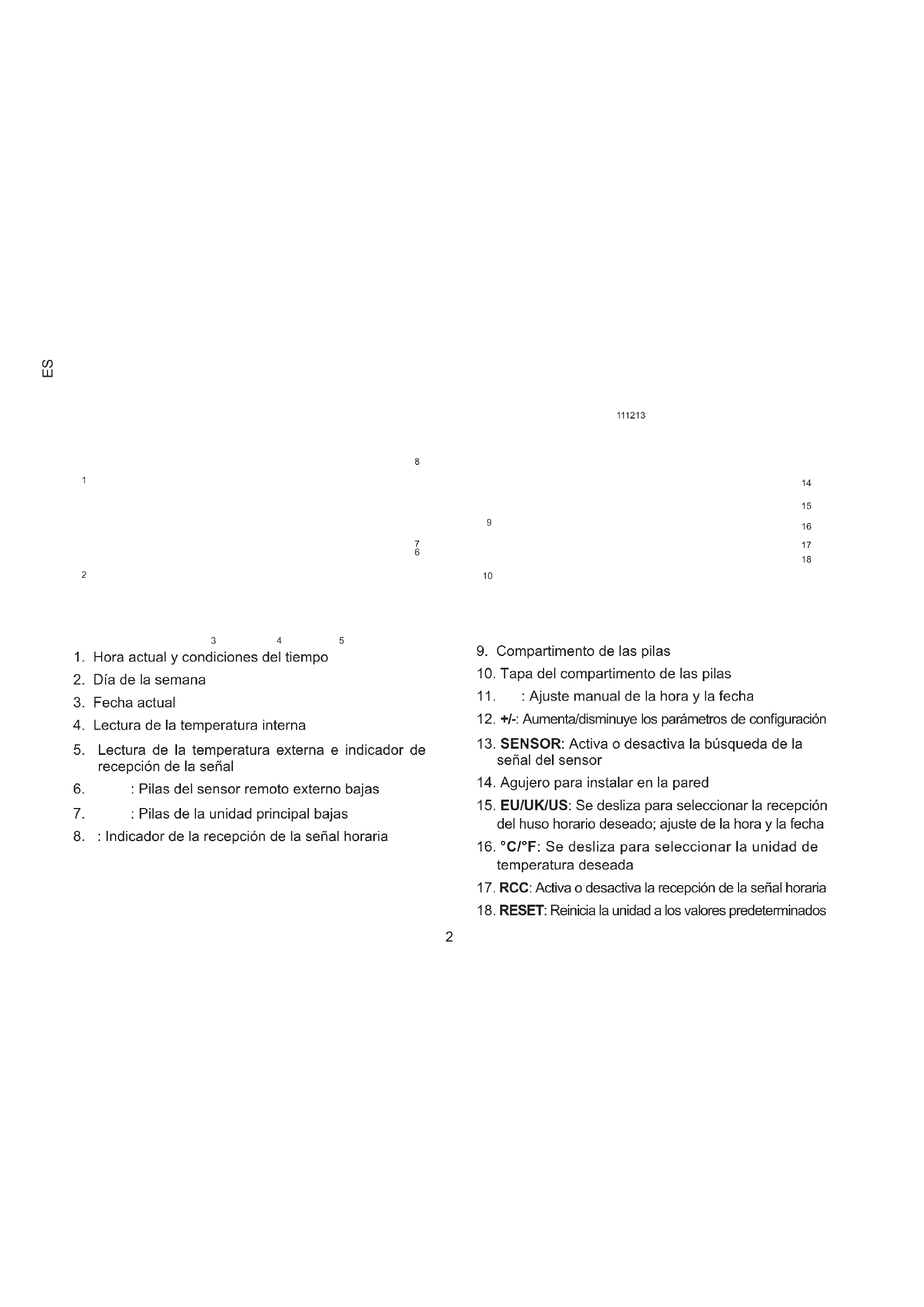 Este reloj está diseñado para sincronizarse automáticamente con la señal horaria. Deslice el botón para seleccionar una región (EU/UK/US). Región Señal EU DCF UK MSF US WWVB Indicador de recepción de la señal horaria: Interfaz de pantalla Descripción Buscando la recepción de la señal horaria Recepción excelente de la señal Recepción débil de la señal No hay recepción de la señal horaria NOTA Pueden transcurrir de 2 a 10 minutos en recibirse la señal horaria. Si la señal es débil, puede tardar hasta 24 horas en recibir una señal válida. NOTA Utilice pilas alcalinas para un funcionamiento más prolongado y pilas de litio para consumidores a temperaturas bajo cero. TRANSMISIÓN DE LOS DATOS DEL SENSOR Cómo buscar un sensor: Mantenga pulsado SENSOR. Manténgalo pulsado de nuevo para detener la búsqueda. El icono de recepción del sensor del área del sensor remoto muestra su estado: Interfaz de pantalla Descripción Unidad principal está buscando el sensor o los sensores. Se ha encontrado un canal. No se puede encontrar el sensor. CONSEJO El alcance de la señal de trasmisión puede variar en función de varios factores. Es posible que necesite experimentar con diferentes ubicaciones hasta obtener unos buenos resultados. JW108_M_ES R1.indd 4 14-8-21 3:09ES