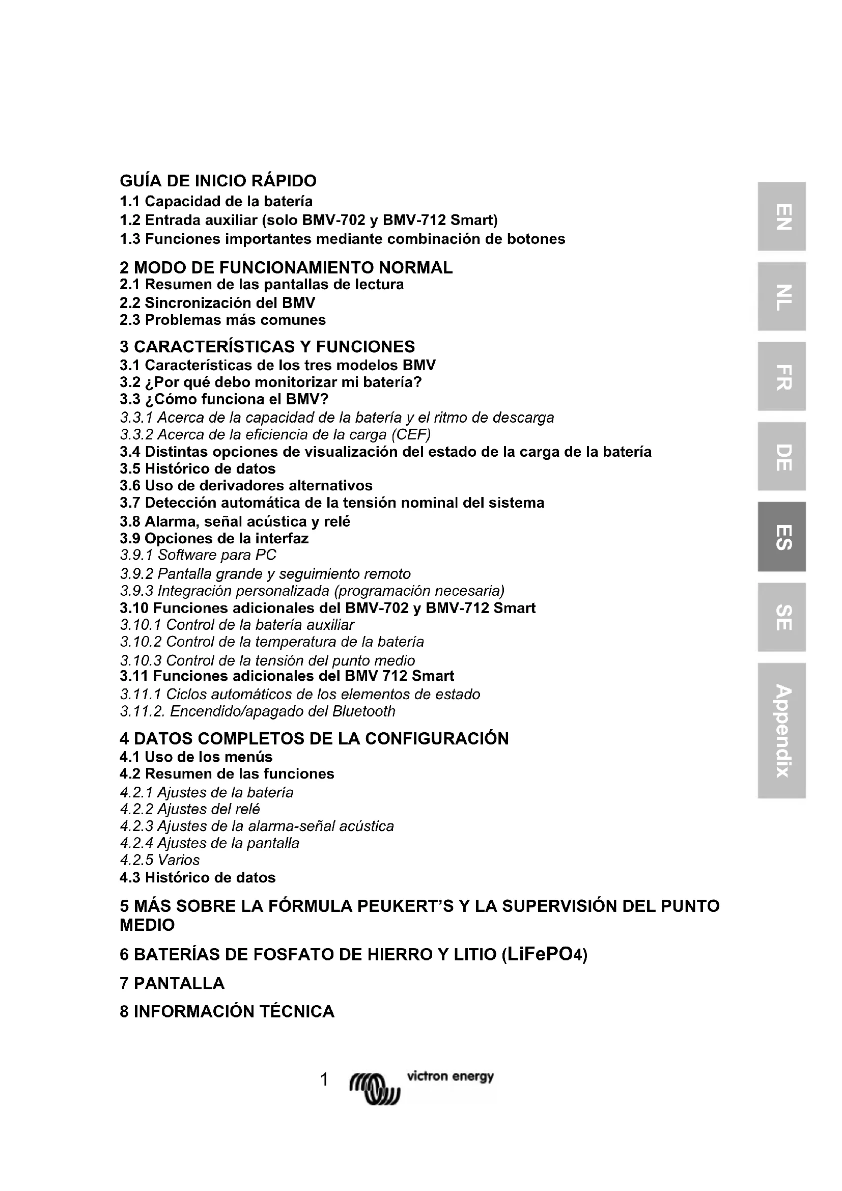 Ningún signo de actividad en la pantalla Probablemente el BMV no esté bien cableado. El cable UTP deberá estar debidamente insertado en ambos extremos, el derivador deberá estar conectado al terminal negativo de la batería, y el cable positivo de la alimentación deberá estar conectado al terminal positivo de la batería con el fusible insertado. El sensor de temperatura (si se utiliza) deberá estar conectado al terminal positivo del banco de baterías (uno de los dos cables del sensor hace las veces de cable de alimentación).12 Las corriente de carga y descarga están invertidas La corriente de carga debería mostrar un valor positivo. Por ejemplo: 1,45A. La corriente de descarga debería mostrar un valor negativo. Por ejemplo: -1,45A. Si las corrientes de carga y descarga están invertidas, deberán invertirse los cables de alimentación del derivador: consulte la guía de instalación rápida. El BMV no se sincroniza automáticamente Una posibilidad es que la batería nunca alcance el estado de carga completa. La otra posibilidad es que la configuración de la tensión de carga debería disminuirse y/o elevar el ajuste de la corriente de cola. Véase sección 4.2.1. El BMV sincroniza demasiado pronto En sistemas solares u otras aplicaciones con corriente de carga fluctuantes, para reducir la probabilidad de que el BMV se resetée al estado de carga 100% prematuramente, se puede hacer lo siguiente: a) Incremente la tensión “cargado” hasta justo por debajo de la tensión de carga de absorción (por ejemplo: 14.2V en caso de que la tensión de absorción sea 14.4V). b) Incremente el tiempo de detección “cargado” y/o disminuya la corriente de cola para evitar un reinicio antes de tiempo debido a la presencia de unas nubes pasajeras. Consulte en la sección 4.2.1. las instrucciones de configuración. Los iconos de sincronización y batería parpadean Esto significa que la batería no está sincronizada. Cargue las baterías y el BMV debería sincronizar automáticamente. Si esto no funcionase, revise los ajustes de sincronización. O, si usted sabe que la batería está completamente cargada y no quiere esperar hasta que el BMV sincronice: mantenga pulsados los botones arriba y abajo simultáneamente hasta oír un pitido. Véase sección 4.2.1.13 NL FR DE ES SE IT PT EN NL FR DE ES SE Appendix