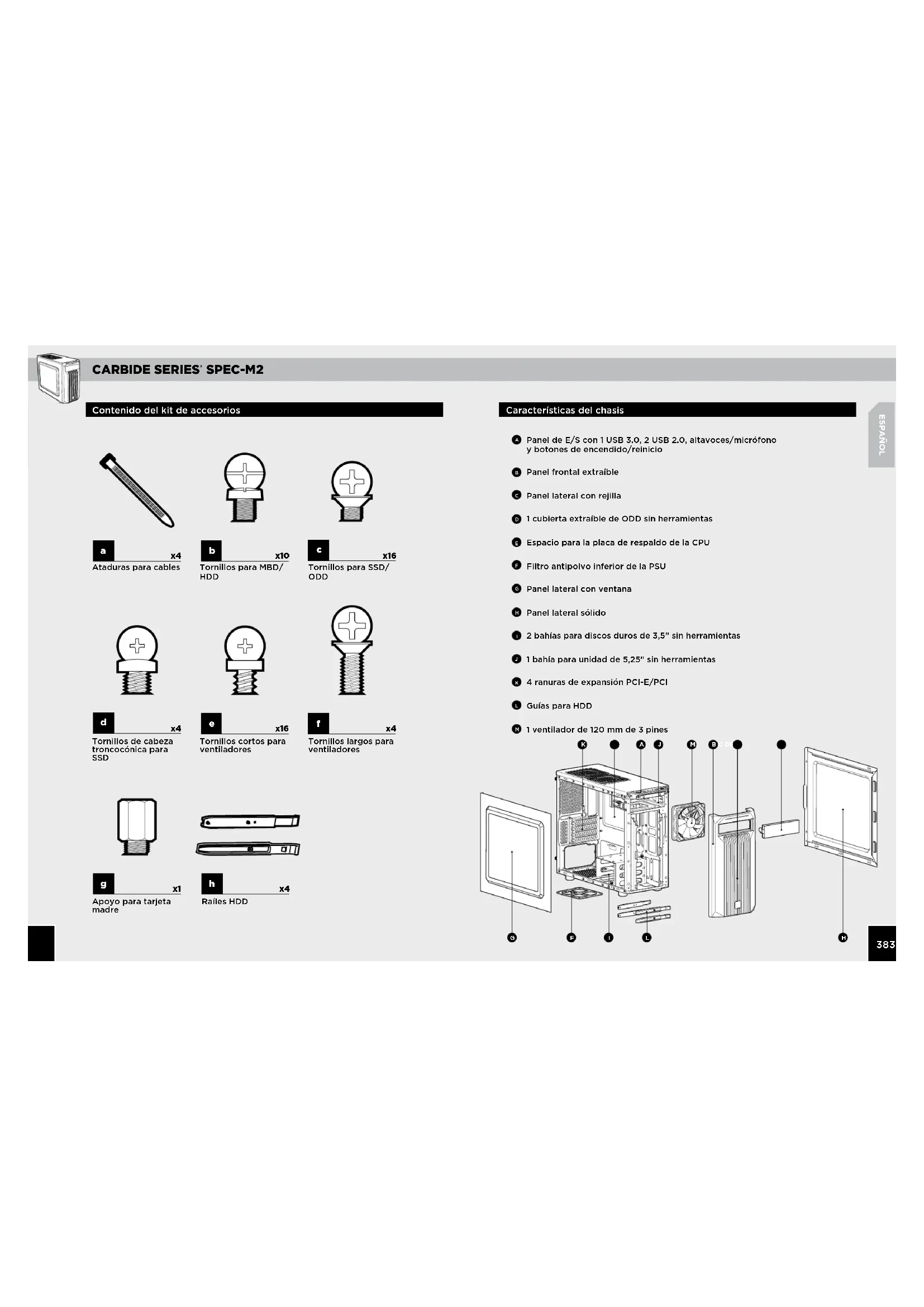 Raíles HDD Panel de E/S con 1 USB 3.0, 2 USB 2.0, altavoces/micrófono y botones de encendido/reinicio Panel frontal extraíble Panel lateral con rejilla 1 cubierta extraíble de ODD sin herramientas Espacio para la placa de respaldo de la CPU Filtro antipolvo inferior de la PSU Panel lateral con ventana Panel lateral sólido 2 bahías para discos duros de 3,5” sin herramientas 1 bahía para unidad de 5,25" sin herramientas 4 ranuras de expansión PCI-E/PCI Guías para HDD 1 ventilador de 120 mm de 3 pines