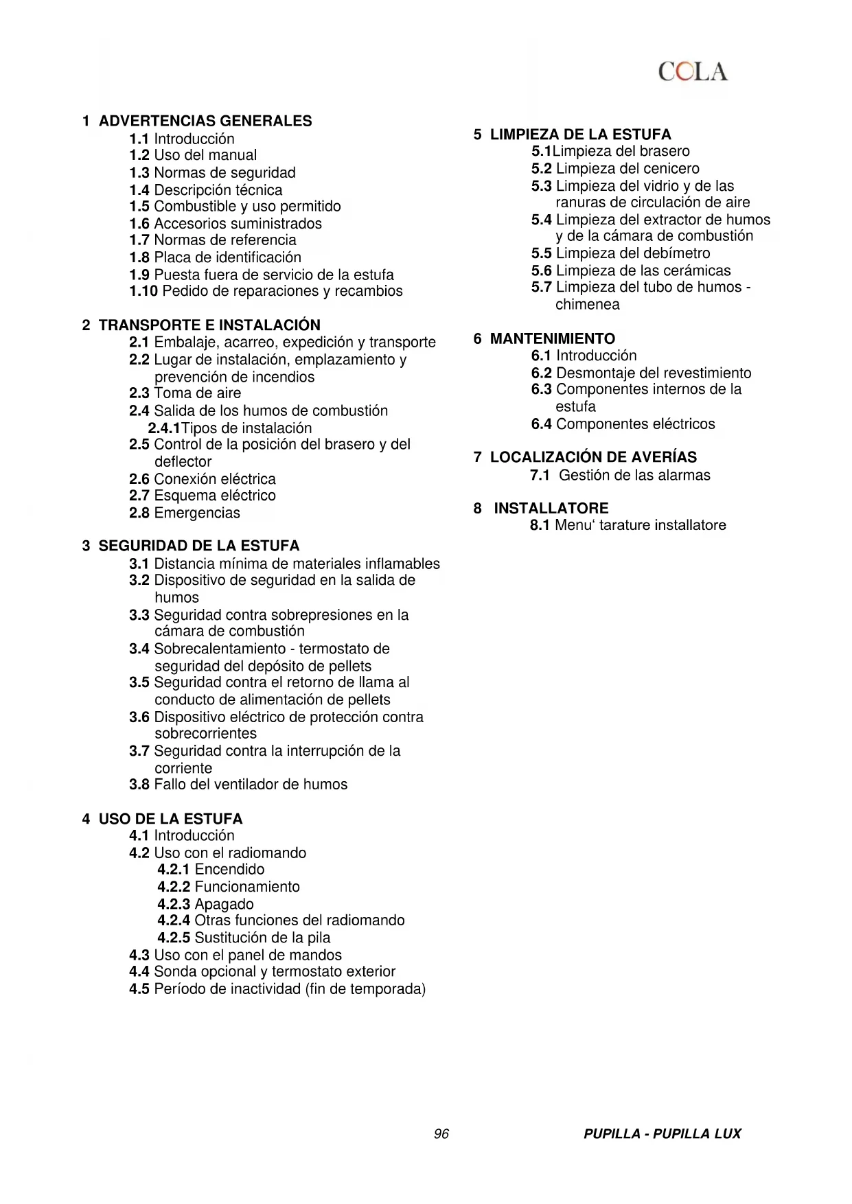 - Leer este manual antes de realizar operaciones de instalación, uso y mantenimiento de la estufa. - Hacer realizar la instalación, la conexión eléctrica, la prueba y el mantenimiento por un técnico autorizado. - Conectar la estufa a una chimenea según normas a través de un terminal inspeccionable. La conexión de varios aparatos a una misma chimenea debe estar autorizada por las normas locales y por el organismo de control de este tipo de sistemas. - Conectar la estufa a la aspiración mediante un tubo o toma de aire desde el exterior. - Conectar la estufa a una toma de corriente homologada de 230 V - 50 Hz. - Controlar que la instalación eléctrica y las tomas de corriente tengan capacidad para soportar la absorción máxima del equipo, indicada en la placa y en este manual. - Antes de hacer cualquier operación de mantenimiento, desconectar la estufa de la corriente eléctrica y dejar que se enfríe. - No utilizar líquidos o sustancias inflamables para encender la estufa o reavivar la llama: con la estufa en marcha, los pellets se encienden automáticamente. - Alimentar la estufa exclusivamente con pellets de madera que tengan las características descritas en este manual. - No utilizar la estufa como incinerador de residuos. - No cerrar en ningún caso las entradas de aire comburente ni las salidas de humos. - No manipular sustancias fácilmente inflamables o explosivas cerca de la estufa encendida. - No quitar ni modificar la rejilla de protección del depósito de pellets ni otros dispositivos de seguridad. - No utilizar la estufa con la puerta de la cámara de combustión abierta o con el vidrio rajado o roto. - Durante el funcionamiento, el intenso calor generado por la combustión de los pellets calienta las superficies externas de la estufa, en particular, la puerta de la cámara, la manija y el tubo de salida de humos. Evitar el contacto con dichas partes sin una protección adecuada. - Mantener a una distancia prudencial los objetos inflamables o que no resistan al calor. - Limpiar correctamente el brasero a cada encendido o recarga de pellets. - Hacer limpiar el conducto y los deflectores de humo, dentro de la cámara de combustión, por un técnico autorizado. - Evitar la formación de humo y de material inquemado durante el encendido y el funcionamiento. Si se acumula mucho pellet sin quemar en el brasero, quitarlo manualmente antes del próximo encendido. - Advertir a los niños y huéspedes de los peligros anteriormente descritos. - En caso de anomalías de funcionamiento, no reencender la estufa hasta que se haya resuelto la causa del problema. - Las modificaciones de la estufa o el uso de recambios no originales sin la debida autorización pueden poner al usuario en peligro, ante lo cual el fabricante queda exento de responsabilidad civil o penal. - Utilizar solo recambios originales indicados por el fabricante. El fabricante no asume ninguna responsabilidad por inconvenientes, roturas o accidentes debidos a la inobservancia de las indicaciones dadas en el presente manual.98 PUPILLA - PUPILLA LUX