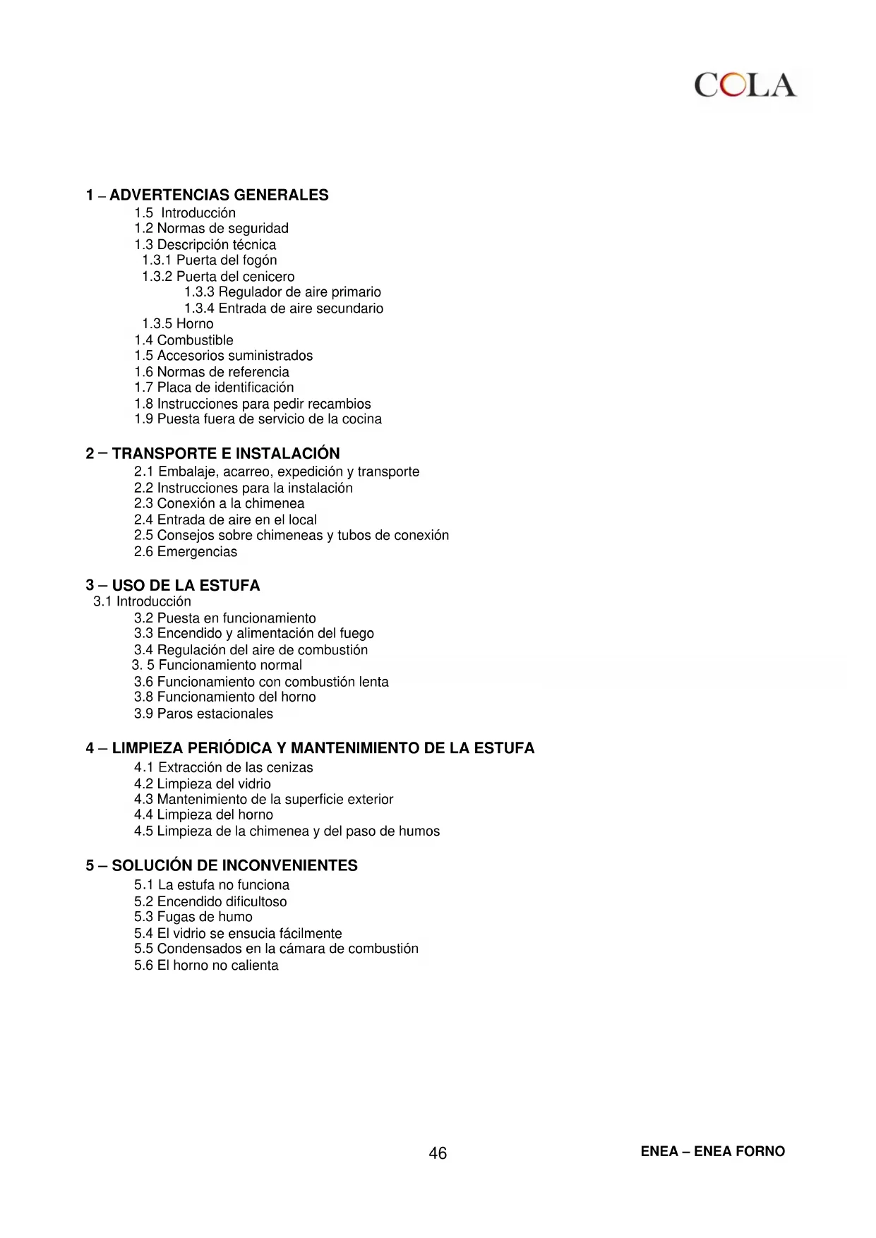 Cola s.r.l. no asume ninguna responsabilidad por inconvenientes, desperfectos o accidentes debidos a la inobservancia de las indicaciones dadas en este manual.ENEA – ENEA FORNO