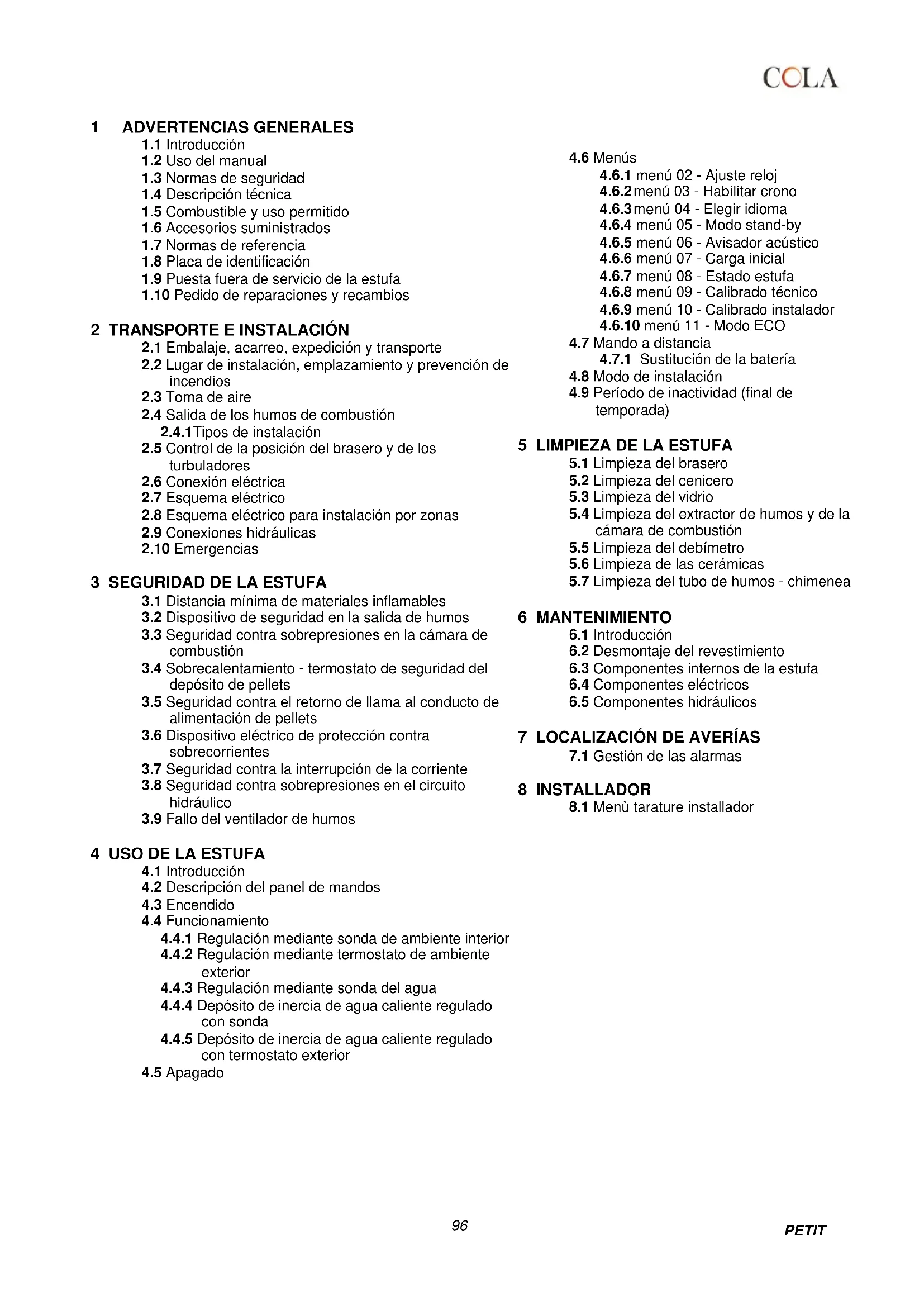 - Leer este manual antes de realizar operaciones de instalación, uso y mantenimiento de la estufa. - Hacer realizar la instalación, la conexión eléctrica, la prueba y el mantenimiento por un técnico autorizado. - Conectar la estufa a una chimenea según normas a través de un terminal inspeccionable. La conexión de varios aparatos a una misma chimenea debe estar autorizada por las normas locales y por el organismo de control de este tipo de sistemas. - Conectar la estufa a la aspiración mediante un tubo o toma de aire desde el exterior. - Conectar la estufa a una toma de corriente homologada de 230 V - 50 Hz. - En el modelo TERMO, conectar el equipo a la instalación de calefacción. No utilizarlo en ningún caso sin la conexión hidráulica y sin cargar agua en la cámara térmica. - Controlar que la instalación eléctrica y las tomas de corriente tengan capacidad para soportar la absorción máxima del equipo, indicada en la placa y en este manual. - Antes de hacer cualquier operación de mantenimiento, desconectar la estufa de la corriente eléctrica y dejar que se enfríe. - No utilizar líquidos o sustancias inflamables para encender la estufa o reavivar la llama: con la estufa en marcha, los pellets se encienden automáticamente. - Alimentar la estufa exclusivamente con pellets de madera que tengan las características descritas en este manual. - No utilizar la estufa como incinerador de residuos. - No cerrar en ningún caso las entradas de aire comburente ni las salidas de humos. - No manipular sustancias fácilmente inflamables o explosivas cerca de la estufa encendida. - No quitar la rejilla de protección del depósito de pellets. - No utilizar la estufa con la puerta de la cámara de combustión abierta o con el vidrio rajado o roto. - Durante el funcionamiento, el intenso calor generado por la combustión de los pellets calienta las superficies externas de la estufa, en particular la puerta de la cámara, la manija y el tubo de salida de humos. Evitar el contacto con dichas partes sin una protección adecuada. - Mantener a una distancia prudencial los objetos inflamables o que no resistan al calor. - Limpiar correctamente el brasero a cada encendido o recarga de pellets. - Evitar la formación de humo y de material inquemado durante el encendido y el funcionamiento. Si se acumula mucho pellet sin quemar en el brasero, quitarlo manualmente antes del próximo encendido. - Hacer limpiar el conducto y los deflectores de humo, dentro de la cámara de combustión, por un técnico autorizado. - Advertir a los niños y huéspedes de los peligros anteriormente descritos. - En caso de anomalías de funcionamiento, no reencender la estufa hasta que se haya resuelto la causa del problema. - Las modificaciones de la estufa o el uso de recambios no originales sin la debida autorización pueden poner al usuario en peligro, ante lo cual el fabricante queda exento de responsabilidad civil o penal. - Utilizar solo recambios originales indicados por el fabricante. El fabricante no asume ninguna responsabilidad por inconvenientes, roturas o accidentes debidos a la inobservancia de las indicaciones dadas en el presente manual.PETIT