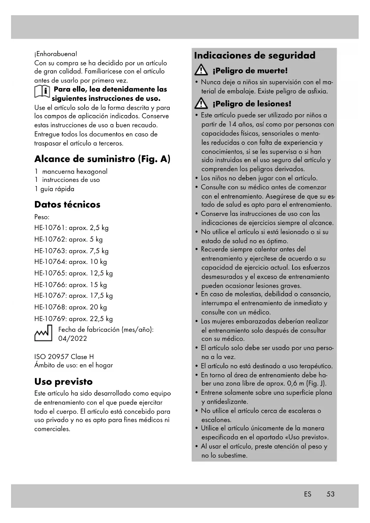 Importante: Asegúrese de que los muslos permanezcan paralelos y juntos. Empuje la pelvis hacia delante, mante- niendo el torso erguido.58 Almacenamiento, limpieza Si no va a utilizarlo, almacene siempre el artícu- lo seco y limpio y a temperatura ambiente. Limpie solo con un paño de limpieza húmedo y después seque frotándolo. ¡IMPORTANTE! No lo limpie con productos de limpieza agresivos. Indicaciones para la eliminación Elimine el artículo y el material de embalaje conforme a la normativa legal local en la ac- tualidad. No deje material de embalaje, como bolsas de plástico, en manos de niños. Guarde el material de embalaje en un lugar inaccesible para éstos. Deseche los productos y embalajes de manera respetuosa con el medio ambiente. El código de reciclaje sirve para identificar diversos materiales para reincorporarlos en el ciclo de reciclaje. El código consta del símbolo de reciclaje, el cual debe reflejar el ciclo de recuperación, y de un número que identifica el material. Indicaciones relativas a la garantía y la gestión de servicios El artículo ha sido fabricado con gran esmero y sometido a controles constantes. Para el mismo, DELTA-SPORT HANDELSKONTOR GmbH ofrece a los clientes finales particulares una garantía de tres años a contar desde la fecha de compra (periodo de garantía) con arreglo a las condiciones que se exponen a continuación. La garantía tiene validez únicamente para fallos del material y fabricación. La garantía no cubre las piezas sometidas a un desgaste normal, las cuales se consideran piezas de desgaste (p. ej., pilas) así como tampoco piezas frágiles como, p. ej., interruptores, baterías o piezas fabricadas en vidrio o cristal. Se excluyen derechos derivados de esta garantía, si se ha realizado un uso incorrecto o abusivo del artículo o que no se encuentre dentro del marco del uso o ámbito de uso previs- tos o si no se ha observado lo recogido en el manual de instrucciones, a no ser que el cliente final demuestre que existen fallos del material o fabricación no derivados de una de las circuns- tancias expuestas anteriormente. Las demandas derivadas de la garantía sólo podrán presentarse dentro del periodo de garantía exhibiendo el comprobante de compra original. Le rogamos, por ello, que conserve el comprobante de compra original. El periodo de garantía no se verá prolongado por ningún tipo de reparación realizada con motivo de la garantía, la garantía legal o como gesto de buena voluntad. Esto se aplica también a las piezas sustituidas o reparadas. Por favor, dirija sus quejas primero a la línea telefónica del servicio de atención al cliente que se indica a continuación o póngase en contacto con nosotros por correo electrónico. Si el caso está cubierto por la garantía, a nuestra elección, repararemos o cambiaremos gratuitamente el artículo o le restituiremos el precio de compra del mismo. De la garantía no se derivan otros derechos. Esta garantía no limitará sus derechos legales, especialmente los derechos de garantía frente al vendedor correspondiente. IAN: 404074_2110 (22,5 kg) IAN: 404075_2110 (20 kg) IAN: 404076_2110 (17,5 kg) IAN: 404077_2110 (15 kg) IAN: 404078_2110 (12,5 kg) IAN: 404080_2110 (10 kg) IAN: 404081_2110 (7,5 kg) IAN: 404083_2110 (5 kg) IAN: 404084_2110 (2,5 kg) Servicio España Tel.: 900 984 989 E-Mail: deltasport@lidl.es ES59DK Hjertelig tillykke! Du har valgt at købe et kvalitetsprodukt. Lær produktet at kende, inden du bruger det første gang. Det gør du ved at læse nedenståen- de brugervejledning omhyggeligt. Brug kun produktet som beskrevet og til de angivne anvendelsesområder. Opbevar denne brugervejledning et sikkert sted. Udlever også alle dokumenter, hvis produktet videregives til en tredjepart. Leveringsomfang (fig. A) 1 x hexagon håndvægt 1 x brugervejledning 1 x kort vejledning Tekniske data Vægt: HE-10761: ca. 2,5 kg HE-10762: ca. 5 kg HE-10763: ca. 7,5 kg HE-10764: ca. 10 kg HE-10765: ca. 12,5 kg HE-10766: ca. 15 kg HE-10767: ca. 17,5 kg HE-10768: ca. 20 kg HE-10769: ca. 22,5 kg Fremstillingsdato (måned/år): 04/2022 ISO 20957 klasse H Anvendelsesområde: i hjemmet Bestemmelsesmæssig brug Denne artikel er udviklet til at være en trænings- artikel, der kan anvendes til træning af hele krop- pen. Artiklen er beregnet til privat brug og er ikke egnet til medicinske og erhvervsmæssige formål. Sikkerhedsanvisninger Livsfare!