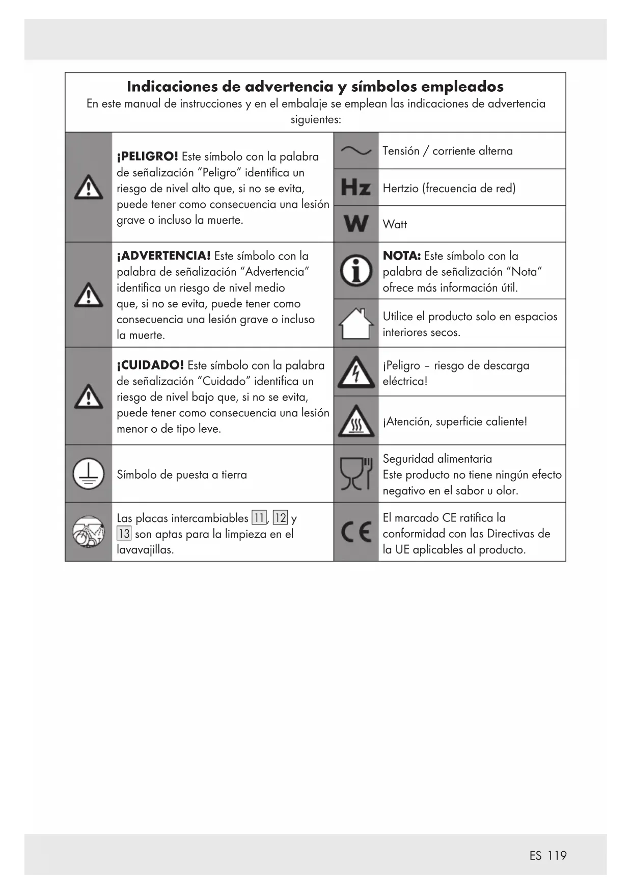 Indicaciones de advertencia y símbolos empleados En este manual de instrucciones y en el embalaje se emplean las indicaciones de advertencia siguientes: ¡PELIGRO! Este símbolo con la palabra de señalización “Peligro” identifica un riesgo de nivel alto que, si no se evita, puede tener como consecuencia una lesión grave o incluso la muerte. Tensión/ corriente alterna Hertzio (frecuencia de red) Watt ¡ADVERTENCIA! Este símbolo con la palabra de señalización “Advertencia” identifica un riesgo de nivel medio que, si no se evita, puede tener como consecuencia una lesión grave o incluso la muerte. NOTA: Este símbolo con la palabra de señalización “Nota” ofrece más información útil. Utilice el producto solo en espacios interiores secos. ¡CUIDADO! Este símbolo con la palabra de señalización “Cuidado” identifica un riesgo de nivel bajo que, si no se evita, puede tener como consecuencia una lesión menor o de tipo leve. ¡Peligro– riesgo de descarga eléctrica! ¡Atención, superficie caliente! Símbolo de puesta a tierra Seguridad alimentaria Este producto no tiene ningún efecto negativo en el sabor u olor. Las placas intercambiables[], [] y [] son aptas para la limpieza en el lavavajillas. El marcado CE ratifica la conformidad con las Directivas de la UE aplicables al producto.120