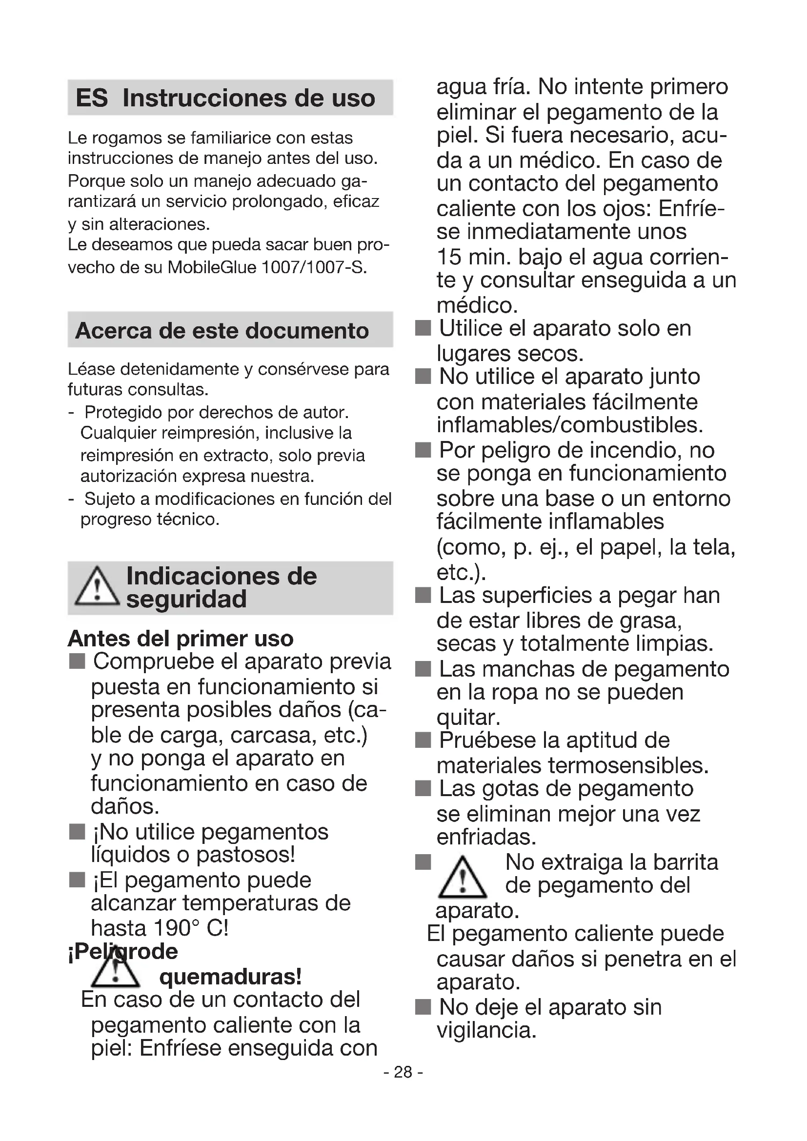 DEL PRODUTTORE DI GARANZIA ANNI DEL PRODUTTORE DI GARANZIA ANNI DEL PRODUTTORE Garanzia del produttore Garanzia del produttore STEINEL GmbH, Dieselstraße 80-84, D-33442 Herzebrock- Clarholz Tutti i prodotti STEINEL soddisfano i mas- simi requisiti di qualità. Per questo motivo siamo lieti in qualità di produttore di conce- derLe come cliente finale una garanzia ai sensi delle condizioni qui di seguito indicate: La garanzia comprende l’assenza di vizi che è dimostrabile essere riconducibili a un difetto di materiale o un errore di produzione e che ci vengono segnalati immediatamente dopo essere stati riscontrati ed entro il perio- do di garanzia. La garanzia vale per tutti i prodotti STEINEL che vengono acquistati e utilizzati in Italia, a esclusione dei prodotti STEINEL Professional. Lei può scegliere di ricorrere alla garanzia chiedendo la riparazione gratuita, la sostituzione gratuita (all’occorrenza con un modello successivo equivalente o di migliore qualità) o l’emissione di una nota di credito. Il periodo di garanzia per il prodotto STEI- NEL da Lei acquistato è di 3 anni a partire dalla data di acquisto del prodotto. Noi assumiamo i costi di trasporto ma non i rischi legati al trasporto della merce che ci viene restituita. Diritti per vizi previsti dalla legge, gratuità Le prestazioni qui descritte valgono in aggiunta ai diritti alla garanzia previsti dalla IT- 28 - ES Instrucciones de uso Le rogamos se familiarice con estas instrucciones de manejo antes del uso. Porque solo un manejo adecuado ga- rantizará un servicio prolongado, eficaz y sin alteraciones. Le deseamos que pueda sacar buen pro- vecho de su MobileGlue 1007/1007-S. Acerca de este documento Léase detenidamente y consérvese para futuras consultas. - Protegido por derechos de autor. Cualquier reimpresión, inclusive la reimpresión en extracto, solo previa autorización expresa nuestra. - Sujeto a modificaciones en función del progreso técnico. Antes del primer uso Compruebe el aparato previa puesta en funcionamiento si presenta posibles daños (ca- ble de carga, carcasa, etc.) y no ponga el aparato en funcionamiento en caso de daños. ¡No utilice pegamentos líquidos o pastosos! ¡El pegamento puede alcanzar temperaturas de hasta 190° C! ¡Peligro de quemaduras! En caso de un contacto del pegamento caliente con la piel: Enfríese enseguida con Indicaciones de seguridad agua fría. No intente primero eliminar el pegamento de la piel. Si fuera necesario, acu- da a un médico. En caso de un contacto del pegamento caliente con los ojos: Enfríe- se inmediatamente unos 15 min. bajo el agua corrien- te y consultar enseguida a un médico. Utilice el aparato solo en lugares secos. No utilice el aparato junto con materiales fácilmente inflamables/combustibles. Por peligro de incendio, no se ponga en funcionamiento sobre una base o un entorno fácilmente inflamables (como, p. ej., el papel, la tela, etc.). Las superficies a pegar han de estar libres de grasa, secas y totalmente limpias. Las manchas de pegamento en la ropa no se pueden quitar. Pruébese la aptitud de materiales termosensibles. Las gotas de pegamento se eliminan mejor una vez enfriadas. No extraiga la barrita de pegamento del aparato. El pegamento caliente puede causar daños si penetra en el aparato. No deje el aparato sin vigilancia.- 29 - Este aparato puede ser utili- zado por niños a partir de los 8 años y por personas con capacidades físicas, senso- riales o mentales reducidas o por personas con falta de ex- periencia y conocimientos si están bajo supervisión o han sido instruidos acerca de un uso seguro del aparato y comprenden los riesgos que puede implicar. Los niños no pueden jugar con el aparato. La limpieza y el mantenimiento del usuario no deberán ser llevados a ca- bo por niños sin la debida vi- gilancia. Solo se garantiza un perfecto funcionamiento si se utilizan barritas de pegamento origi- nales STEINEL. Cable de carga USB Mantenga limpio el cable de carga. Existe riesgo de des- carga eléctrica debido a la contaminación. Guarde el aparato en un rango de temperatura de 0°C a 35 °C. Cargue el aparato únicamen- te con el cable de carga USB suministrado (tipo 15.3841). No cargue baterías de ter- ceros. De lo contrario, existe riesgo de incendio y explo- sión. Uso previsto Esta herramienta eléctrica solo está pre- vista para el pegado con cola sin disol- ventes de materiales de manualidades y piezas de maquetación usuales en el ámbito doméstico. Acumulador No abra el aparato ni la batería. Existe peligro de cortocircuito. La batería no puede extraerse. En caso de problemas, diríjase a su punto de venta. El acumulador de iones de litio puede cargarse en cualquier momento sin que se acorte su vida útil. La inte- rrupción del proceso de car- ga no perjudica la batería. Guárdese el aparato con la batería cargada en caso de no usarlo durante un tiempo prolongado. Esto alarga la vida útil del acumulador de iones de litio. El uso inapropiado o el de- terioro de la batería pueden provocar que se desprendan vapores. Consulte a un mé- dico en caso de molestias y asegure una buena venti- lación. Los vapores pueden irritar las vías respiratorias. ES- 30 - Descripción del aparato Cable de carga USB Indicador LED Toma para cable de carga Pulsador ON/OFF Gatillo de avance Barrita de pegamento Función y manejo ■ Cárguese por completo antes de la primera puesta en funcionamiento (2 a 3 h), para alargar la vida útil del acu- mulador. (vse. Carga/Funcionamiento) ■ Introducir la barrita de pegamento por detrás en el canal calentador. ■ La primera vez que se use habrá que activar el avance varias veces para llenar de pegamento la cámara cale- factora. En caso dado, será necesario empujar también un poco la barrita. ■ Para que no se conecte el aparato sin vigilancia, el pulsador ha de presionarse durante unos 2 seg. LED verde parpadea durante 15 seg. ■ Activar el avance y aplicar la cola por una cara. 