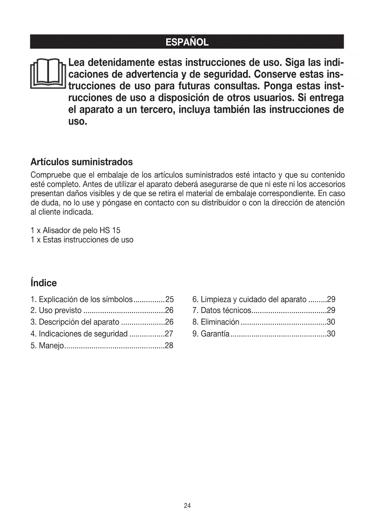 Pour plus d’informations sur la garantie et les conditions de garantie, veuillez consulter la fiche de garantie fournie. Sous réserve d’erreurs et de modifications24 ESPAÑOL Lea detenidamente estas instrucciones de uso. Siga las indi- caciones de advertencia y de seguridad. Conserve estas ins- trucciones de uso para futuras consultas. Ponga estas inst- rucciones de uso a disposición de otros usuarios. Si entrega el aparato a un tercero, incluya también las instrucciones de uso. Artículos suministrados Compruebe que el embalaje de los artículos suministrados esté intacto y que su contenido esté completo. Antes de utilizar el aparato deberá asegurarse de que ni este ni los accesorios presentan daños visibles y de que se retira el material de embalaje correspondiente. En caso de duda, no lo use y póngase en contacto con su distribuidor o con la dirección de atención al cliente indicada. 1 x Alisador de pelo HS 15 1 x Estas instrucciones de uso