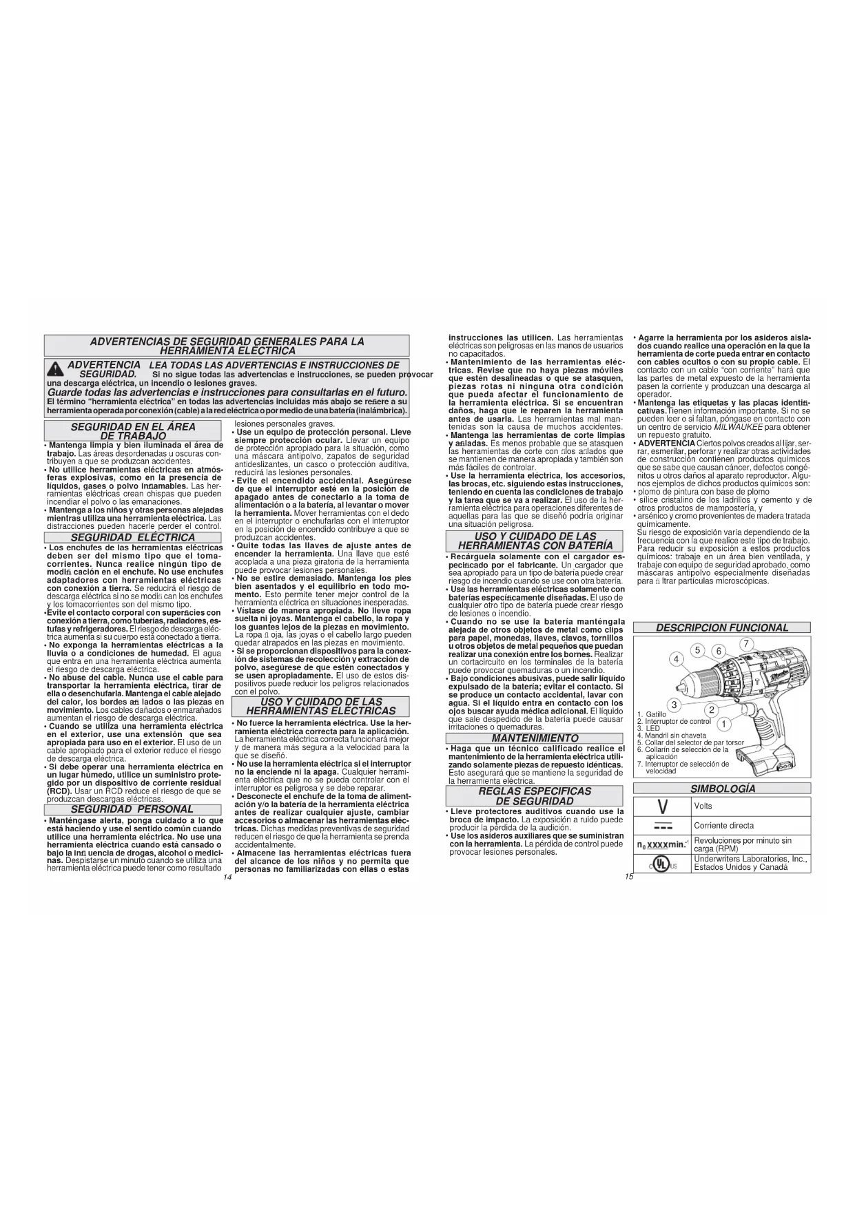 - Probarla para asegurar una adecuada operación mecánicay eléctrica Si la herramienta no arranca u opera a toda su potencia con una batería completamente cargada, limpie, con una goma o borrador, los contactos de la batería y de la herramienta. Si aun asi la her- ramienta no trabaja correctamente, regrésela, con el cargador y la batería, a un centro de servicio MILWAUKEE para que sea reparada. MANTENIMIENTO ADVERTENCIA Para reducir el riesgo de una lesión, desconecte siempre la herramienta antes de darle cualquier man- tenimiento. Nunca desarme la herramienta ni trate de hacer modifi caciones en el sistema eléctrico de la misma. Acuda siempre a un Centro de Servicio MILWAUKEE para TODAS las reparaciones. ADVERTENCIA Para reducir el riesgo de una explosión, no queme nunca una batería, aun si está dañada, “muerta” o completamente descargada. Limpieza Limpie el polvo y suciedad de las ventilas del carga- dor y la herramienta. Mantenga los mangos y em- puñaduras limpios, secos y libres de aceite o grasa. Use solo jabón neutro y un trapo húmedo para limpiar la herramienta, batería y el cargador, ya que algunos substancias y solventes limpiadores son dañinos a los plásticos y partes aislantes. Algu- nos de estos incluyen: gasolina, turpentina,thíner, lacas, thíner para pinturas, solventes para limpieza con cloro, amoníaco y detergentes caseros que tengan amonia. Nunca usa solventes infl amables o combustibles cerca de una herramienta. Reparaciones Si su herramienta, batería o cargador están daña- dos, envíela al centro de servicio más cercano. Para reducir la posibilidad de atoramiento de la broca: