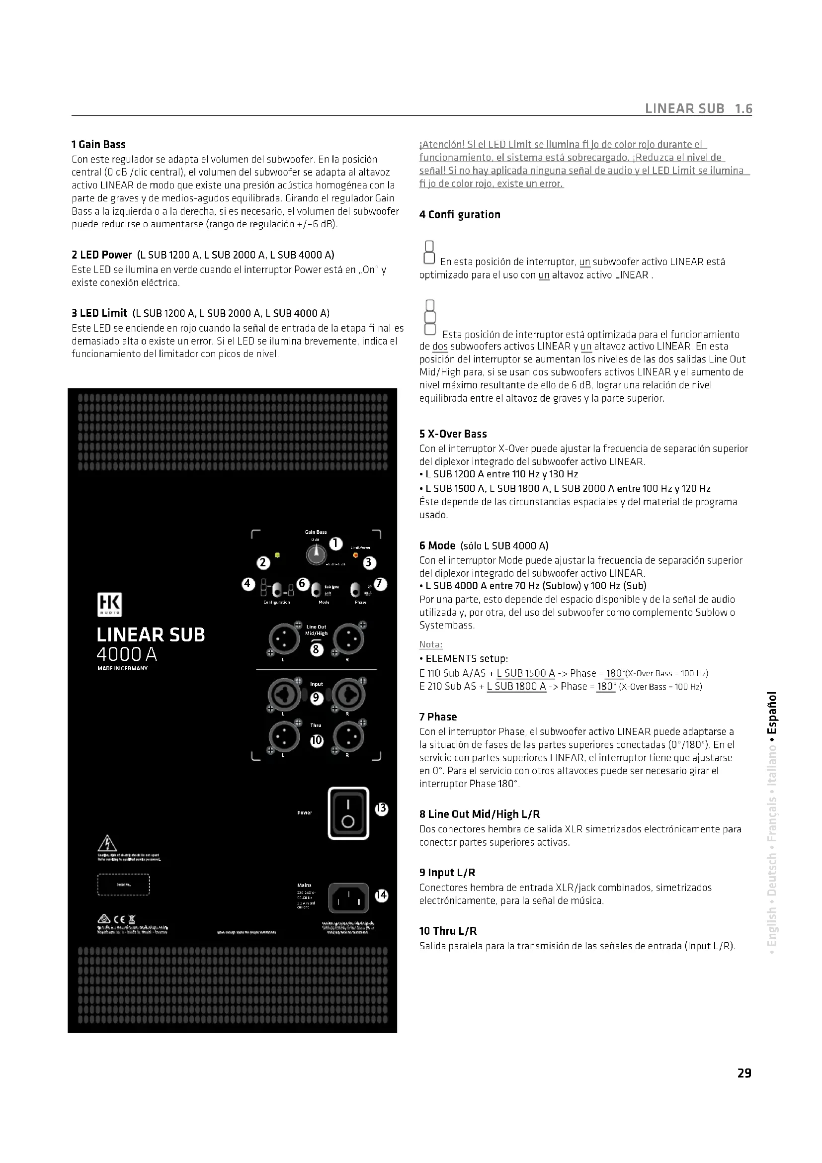 1 Gain Bass Con este regulador se adapta el volumen del subwoofer. En la posición central (0 dB /clic central), el volumen del subwoofer se adapta al altavoz activo LINEAR de modo que existe una presión acústica homogénea con la parte de graves y de medios-agudos equilibrada. Girando el regulador Gain Bass a la izquierda o a la derecha, si es necesario, el volumen del subwoofer puede reducirse o aumentarse (rango de regulación+/–6dB). 2 LED Power (L SUB 1200 A, L SUB 2000 A, L SUB 4000 A) Este LED se ilumina en verde cuando el interruptor Power está en „On“ y existe conexión eléctrica. 3 LED Limit (L SUB 1200 A, L SUB 2000 A, L SUB 4000 A) Este LED se enciende en rojo cuando la señal de entrada de la etapa fi nal es demasiado alta o existe un error. Si el LED se ilumina brevemente, indica el funcionamiento del limitador con picos de nivel. ¡Atención! Si el LED Limit se ilumina fi jo de color rojo durante el funcionamiento, el sistema está sobrecargado. ¡Reduzca el nivel de señal! Si no hay aplicada ninguna señal de audio y el LED Limit se ilumina fi jo de color rojo, existe un error. 4 Confi guration En esta posición de interruptor, un subwoofer activo LINEAR está optimizado para el uso con un altavoz activo LINEAR . Esta posición de interruptor está optimizada para el funcionamiento de dos subwoofers activos LINEAR y un altavoz activo LINEAR. En esta posición del interruptor se aumentan los niveles de las dos salidas Line Out Mid/High para, si se usan dos subwoofers activos LINEAR y el aumento de nivel máximo resultante de ello de 6 dB, lograr una relación de nivel equilibrada entre el altavoz de graves y la parte superior. 5 X-Over Bass Con el interruptor X-Over puede ajustar la frecuencia de separación superior del diplexor integrado del subwoofer activo LINEAR.