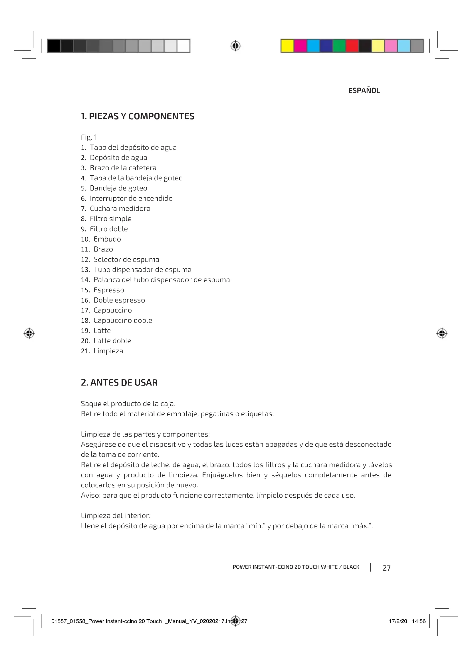 Saque el producto de la caja. Retire todo el material de embalaje, pegatinas o etiquetas. Limpieza de las partes y componentes: Asegúrese de que el dispositivo y todas las luces están apagadas y de que está desconectado de la toma de corriente. Retire el depósito de leche, de agua, el brazo, todos los filtros y la cuchara medidora y lávelos con agua y producto de limpieza. Enjuáguelos bien y séquelos completamente antes de colocarlos en su posición de nuevo. Aviso: para que el producto funcione correctamente, límpielo después de cada uso. Limpieza del interior: Llene el depósito de agua por encima de la marca “mín.” y por debajo de la marca “máx.”. 01557_01558_Power Instant-ccino 20 Touch _Manual_YV_02020217.indd 2701557_01558_Power Instant-ccino 20 Touch _Manual_YV_02020217.indd 27 17/2/20 14:5617/2/20 14:5628 ESPAÑOL Llene el depósito de leche con agua por encima de la marca “mín.” y por debajo de la marca “máx.”. Seleccione uno de los filtros y colóquelo dentro del brazo. Inserte el brazo en la unidad, asegurándose de que está correctamente ajustado y ponga un vaso debajo. Asegúrese de que el tubo dispensador está dentro del vaso. Conecte el dispositivo a una toma de corriente. Accione el interruptor de encendido. Los botones del dispositivo parpadearán 3 veces y la máquina emitirá un pitido. Una vez que los iconos se iluminen de forma fija, pulse el botón de “Cappuccino doble”. El proceso habrá terminado cuando todos los iconos estén iluminados de forma fija.