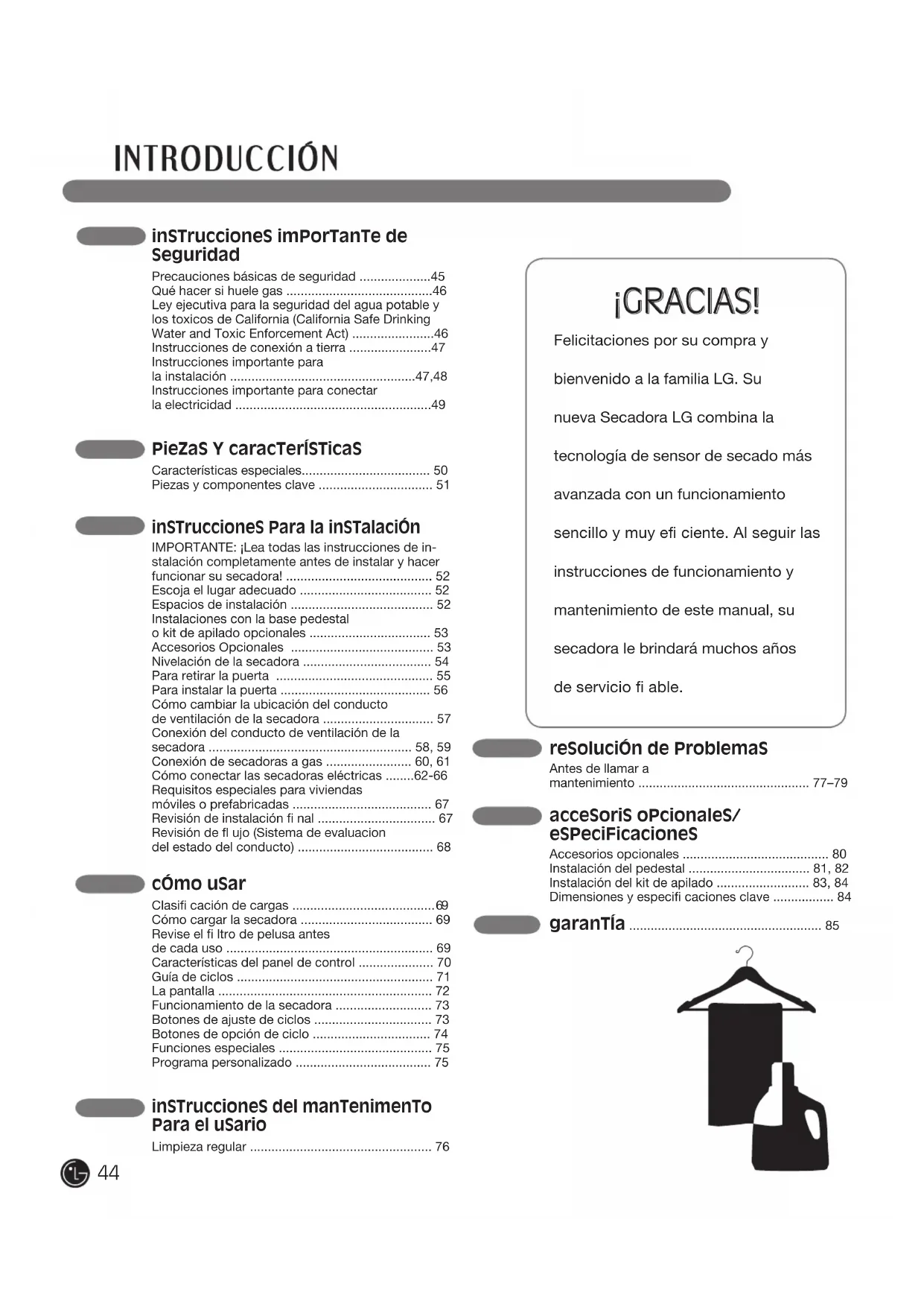 - Únicamenteuntécnicocalificado de mantenimiento, agencia de mantenimiento o compañía de gas deberán realizar el mantenimiento y la instalación. QUÉ HACER SI HUELE GAS: leY eJecuTiva Para la Seguridad del agua PoTable Y loS TÓXicoS de caliFornia (caliFornia SaFe drinKing WaTer and ToXic enForcemenT acT) Esta ley requiere que el gobernador de California publique un listado de sustancias conocidas en el estado que causan cáncer, defectos congénitos u otras lesiones reproductivas, y obliga a los negocios a alertar a los clientes sobre la posible exposición a tales sustancias. Los electrodomésticos a gas pueden causar exposición leve a cuatro de estas sustancias, principalmente benceno, monóxido de carbono, formaldehído y hollín, generado principalmente por la combustión parcial del gas natural o los combustibles LP (petróleo líquido). Las secadoras calibradas adecuadamente minimizarán la combustión parcial. Para minimizar incluso más la exposición a estas sustancias, se puede dotar a la secadora de la ventilación adecuada al exterior. LEA TODAS LA INSTRUCCIONES ANTES DE USAR wADVERTENCIA Por su seguridad, se debe seguir la información indicada en este manual para minimizar el riesgo de incendio o explosión, descarga eléctrica, o para prevenir daños a la propiedad, lesiones personales o muerte. 46inSTruccioneS de coneXiÓn a Tierra Este electrodoméstico deberá estar conectado a tierra. En caso de avería o mal funcionamiento, la conexión a tierra reducirá el riesgo de descargas eléctricas al brindar un camino con una resistencia menor para la corriente eléctrica. Este electrodoméstico debe estar equipado con un cable con un conductor para la conexión a tierra del equipo y un enchufe con conexión a tierra. El enchufe deberá estar conectado a una toma de corriente instalada en forma adecuada y con conexión a tierra de acuerdo con todos los códigos y ordenanzas locales. wADVERTENCIA — Una conexión inapropiada del conductor de conexión a tierra del equipo puede provocar riesgos de descargas eléctricas. Consulte a un electricista calificado o personal del servicio si tiene dudas de que el electrodoméstico se encuentre conectado a tierra apropiadamente. No modifique el enchufe que se entrega con el electrodoméstico. Si no coincide con la toma de corriente, contrate a un electricista calificado para que instale una toma de corriente en forma adecuada. Este electrodoméstico debe estar conectado a un sistema de cableado de metal permanente con conexión a tierra o se debe tender un conducto para la conexión a tierra del equipo con los conductores del circuito y conectado al terminal de tierra del equipo o al conductor de suministro del electrodoméstico. Si la secadora no se encuentra adecuadamente conectada a tierra se pueden producir descargas eléctricas. inSTruccioneS imPorTanTe Para la inSTalaciÓn