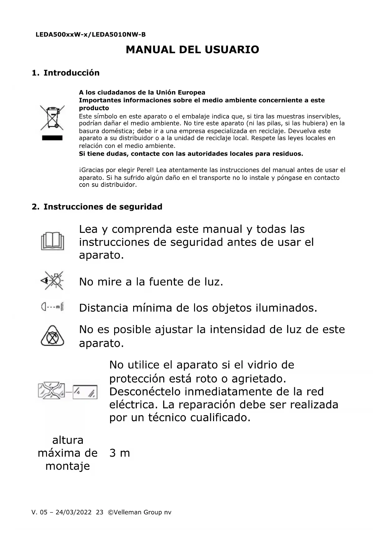 Velleman Group nv dispone de los derechos de autor para este manual del usuario. Todos los derechos mundiales reservados. Está estrictamente prohibido reproducir, traducir, copiar, editar y guardar este manual del usuario o partes de ello sin el consentimiento previo por escrito del propietario del copyright.LEDA500xxW-x/LEDA5010NW-B