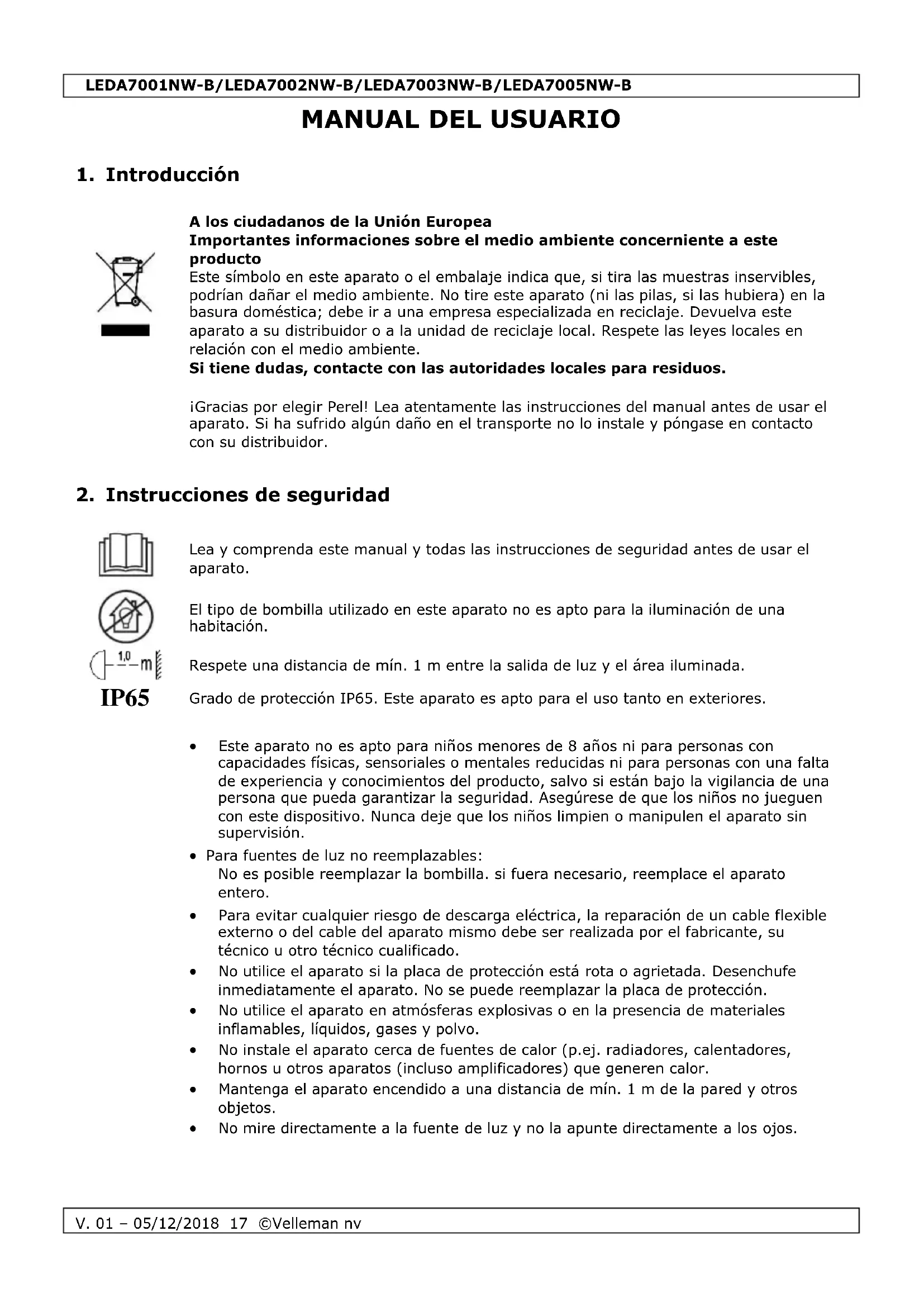 Velleman NV dispone de los derechos de autor para este manual del usuario. Todos los derechos mundiales reservados. Está estrictamente prohibido reproducir, traducir, copiar, editar y guardar este manual del usuario o partes de ello sin el consentimiento previo por escrito del propietario del copyright.LEDA7001NW-B/LEDA7002NW-B/LEDA7003NW-B/LEDA7005NW-B