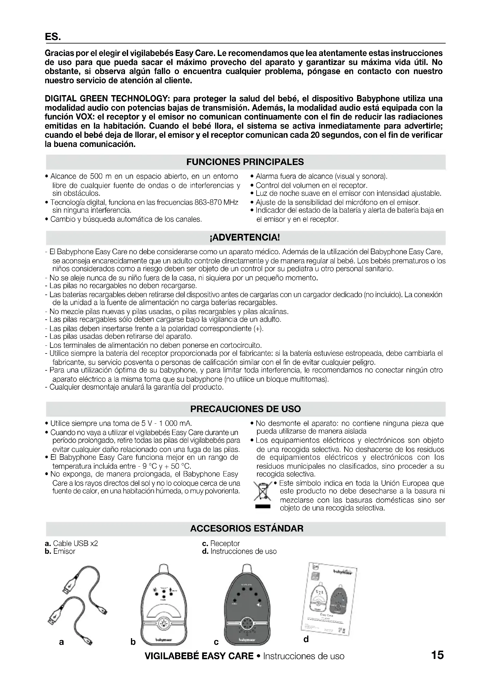 ES. Gracias por el elegir el vigilabebés Easy Care. Le recomendamos que lea atentamente estas instrucciones de uso para que pueda sacar el máximo provecho del aparato y garantizar su máxima vida útil. No obstante, si observa algún fallo o encuentra cualquier problema, póngase en contacto con nuestro nuestro servicio de atención al cliente. DIGITAL GREEN TECHNOLOGY: para proteger la salud del bebé, el dispositivo Babyphone utiliza una modalidad audio con potencias bajas de transmisión. Además, la modalidad audio está equipada con la función VOX: el receptor y el emisor no comunican continuamente con el fin de reducir las radiaciones emitidas en la habitación. Cuando el bebé llora, el sistema se activa inmediatamente para advertirle; cuando el bebé deja de llorar, el emisor y el receptor comunican cada 20 segundos, con el fin de verificar la buena comunicación. FUNCIONES PRINCIPALES