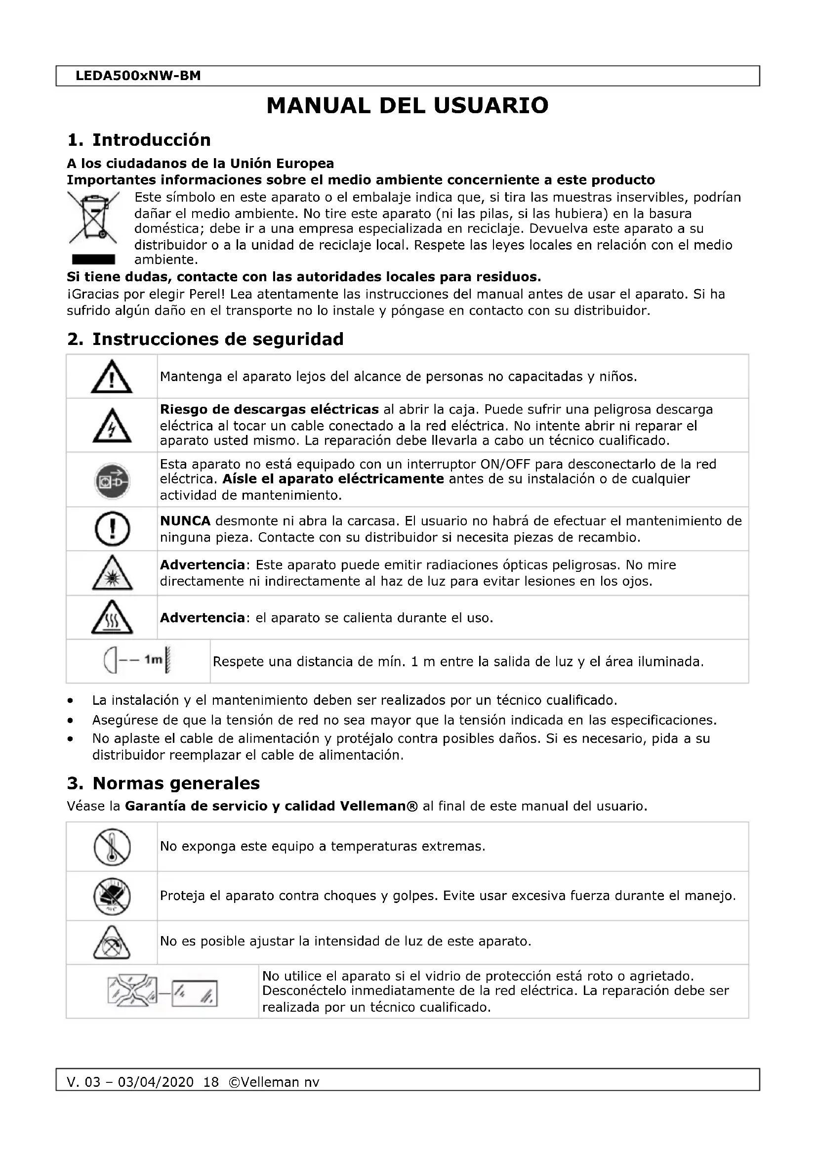 Velleman NV dispone de los derechos de autor para este manual del usuario. Todos los derechos mundiales reservados. Está estrictamente prohibido reproducir, traducir, copiar, editar y guardar este manual del usuario o partes de ello sin el consentimiento previo por escrito del propietario del copyright.LEDA500xNW-BM