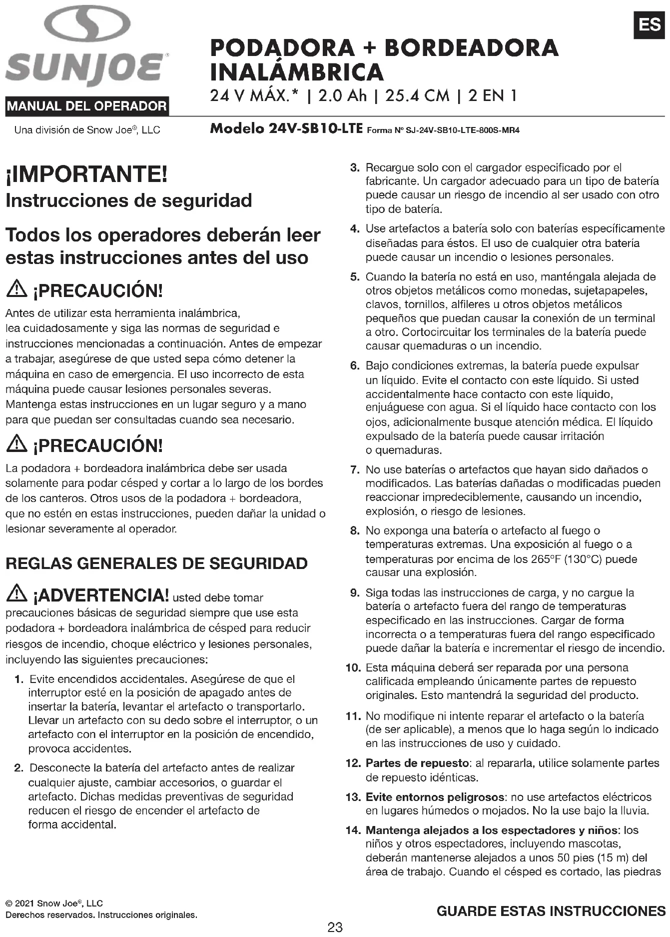 MANUAL DE USUARIO 24VLAWNBDL Sun Joe