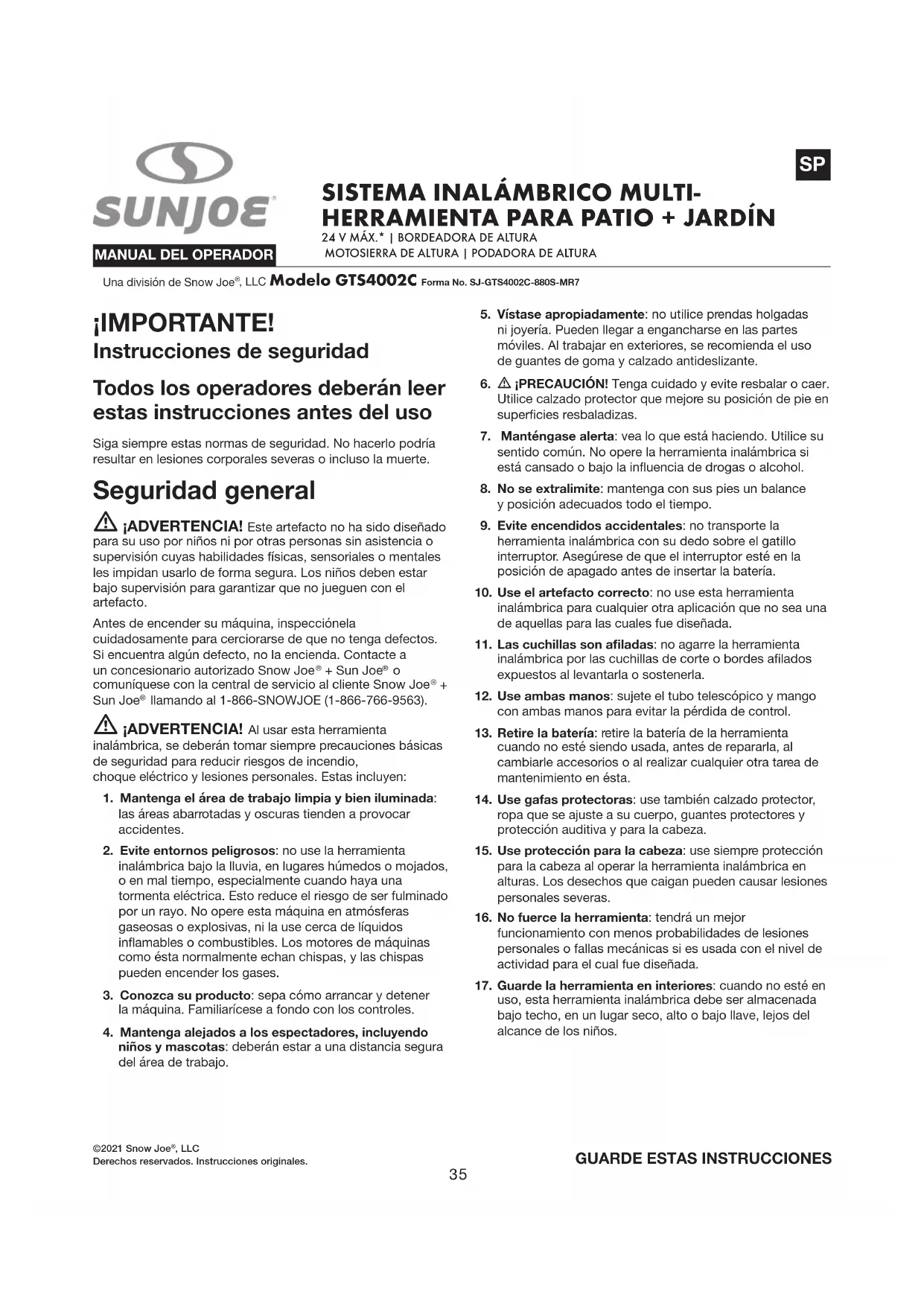 MANUAL DE USUARIO GTS4002C Sun Joe