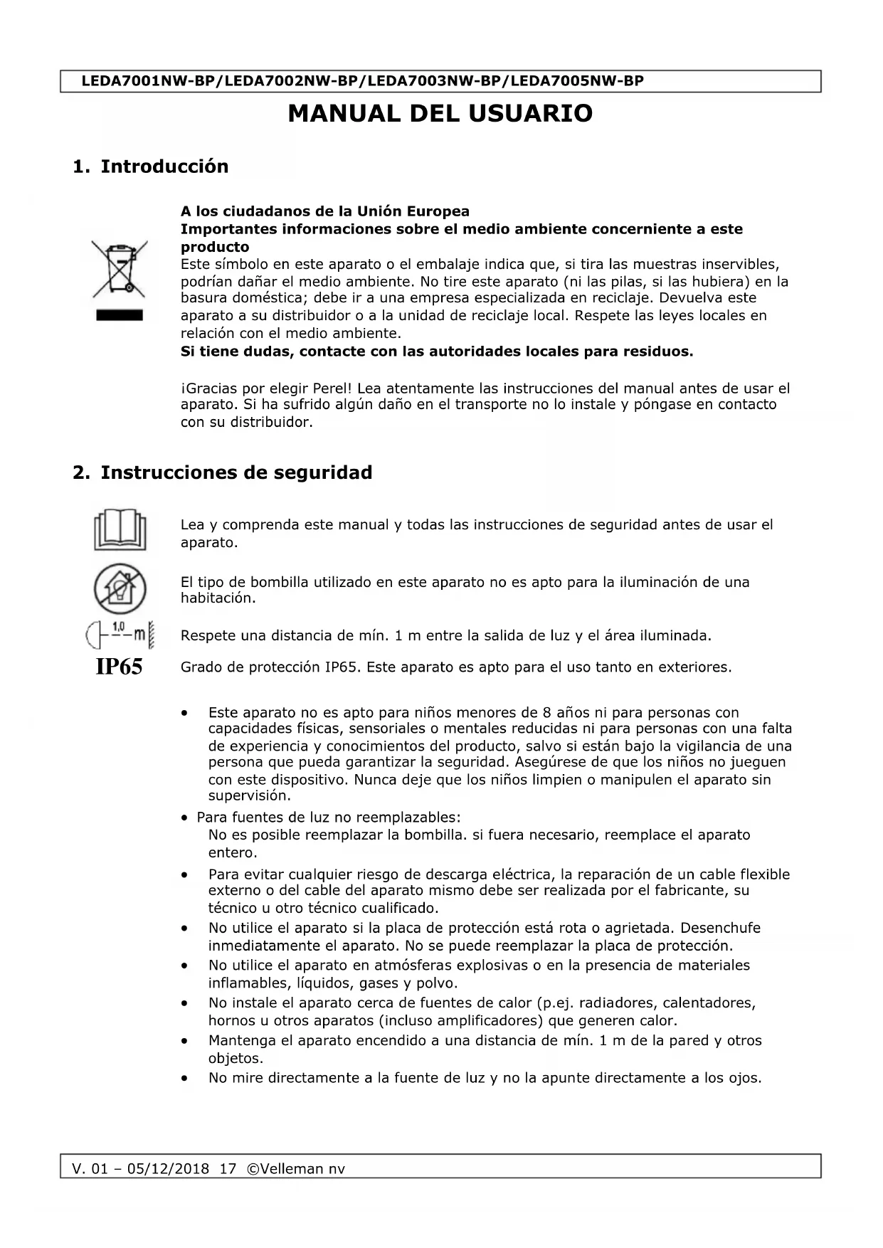 Velleman NV dispone de los derechos de autor para este manual del usuario. Todos los derechos mundiales reservados. Está estrictamente prohibido reproducir, traducir, copiar, editar y guardar este manual del usuario o partes de ello sin el consentimiento previo por escrito del propietario del copyright.LEDA7001NW-BP/LEDA7002NW-BP/LEDA7003NW-BP/LEDA7005NW-BP