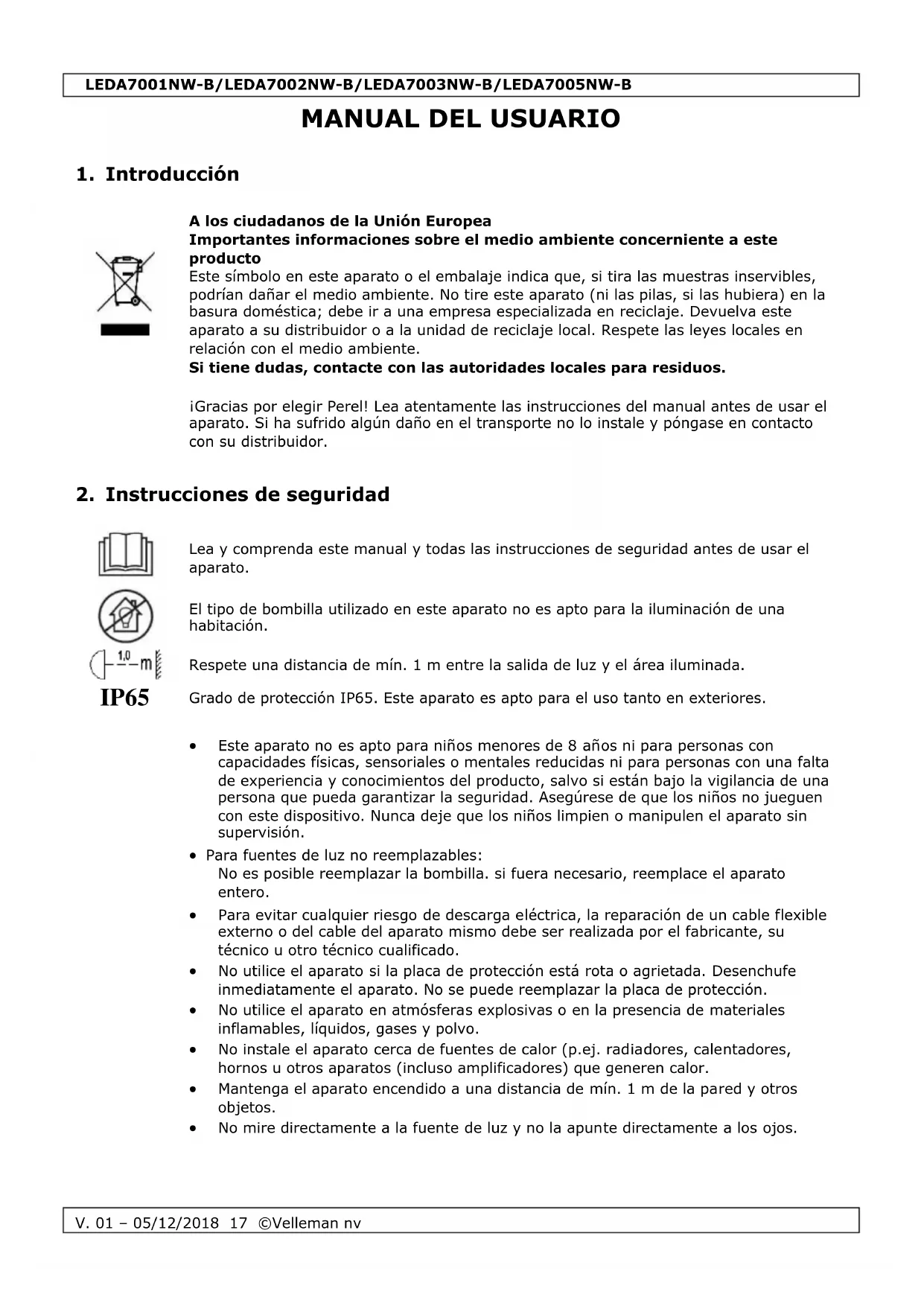 Velleman NV dispone de los derechos de autor para este manual del usuario. Todos los derechos mundiales reservados. Está estrictamente prohibido reproducir, traducir, copiar, editar y guardar este manual del usuario o partes de ello sin el consentimiento previo por escrito del propietario del copyright.LEDA7001NW-B/LEDA7002NW-B/LEDA7003NW-B/LEDA7005NW-B