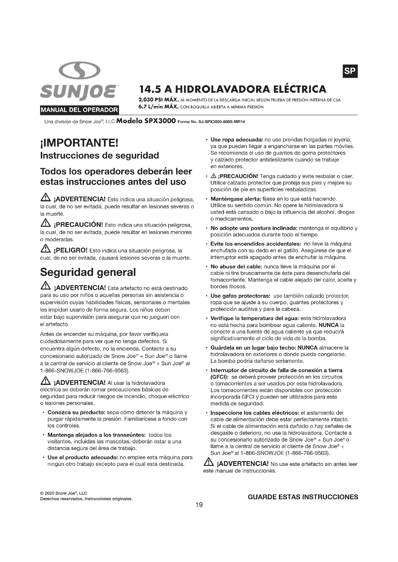 1-866-SNOWJOE (1-866-766-9563). m ¡ADVERTENCIA! Al usar la hidrolavadora eléctrica se deberán tomar precauciones básicas de seguridad para reducir riesgos de incendio, choque eléctrico o lesiones personales.