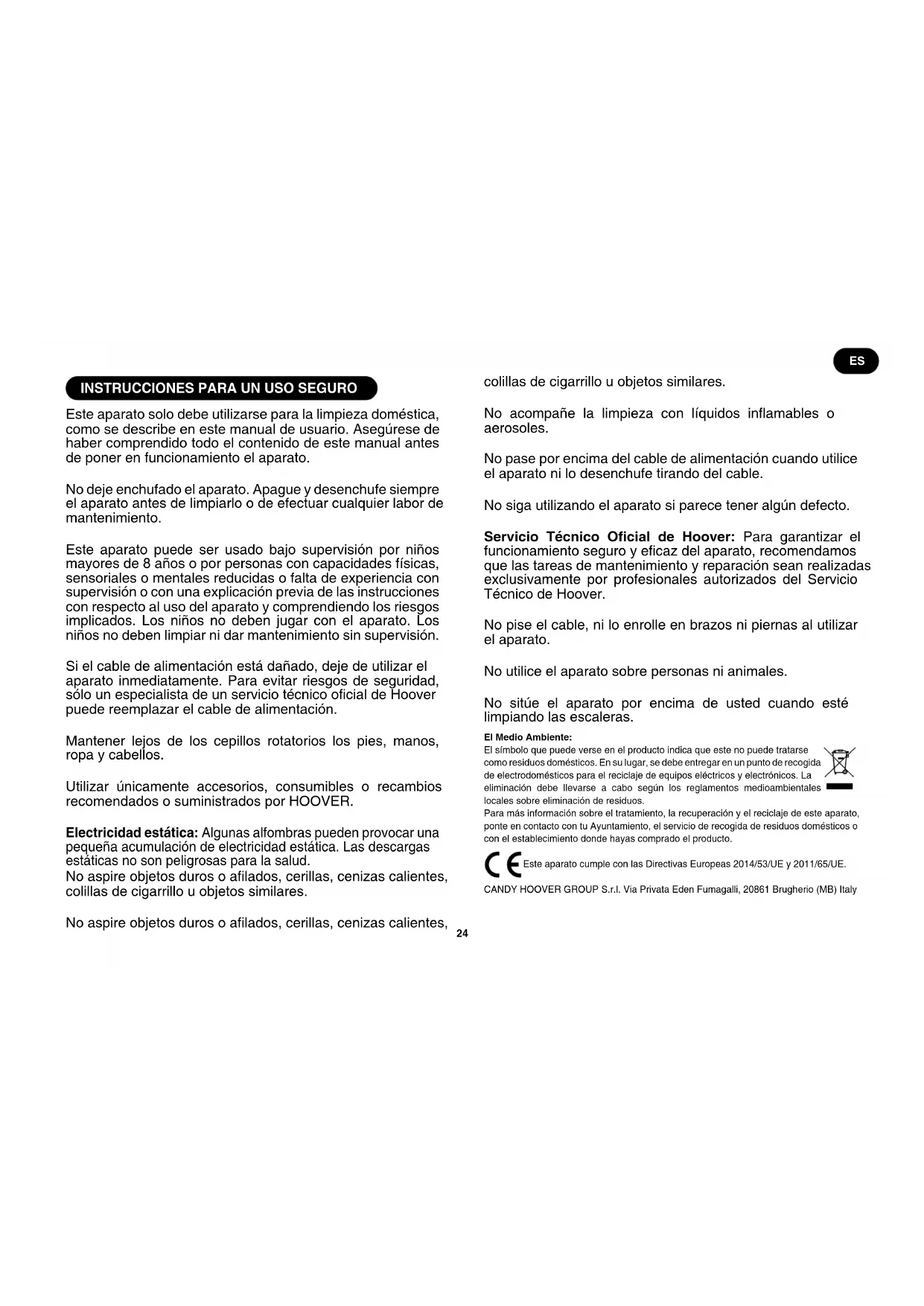 Este aparato solo debe utilizarse para la limpieza doméstica, como se describe en este manual de usuario. Asegúrese de haber comprendido todo el contenido de este manual antes de poner en funcionamiento el aparato. No deje enchufado el aparato. Apague y desenchufe siempre el aparato antes de limpiarlo o de efectuar cualquier labor de mantenimiento. Este aparato puede ser usado bajo supervisión por niños mayores de 8 años o por personas con capacidades físicas, sensoriales o mentales reducidas o falta de experiencia con supervisión o con una explicación previa de las instrucciones con respecto al uso del aparato y comprendiendo los riesgos implicados. Los niños no deben jugar con el aparato. Los niños no deben limpiar ni dar mantenimiento sin supervisión. Si el cable de alimentación está dañado, deje de utilizar el aparato inmediatamente. Para evitar riesgos de seguridad, sólo un especialista de un servicio técnico ocial de Hoover puede reemplazar el cable de alimentación. Mantener lejos de los cepillos rotatorios los pies, manos, ropa y cabellos. Utilizar únicamente accesorios, consumibles o recambios recomendados o suministrados por HOOVER. Electricidad estática: Algunas alfombras pueden provocar una pequeña acumulación de electricidad estática. Las descargas estáticas no son peligrosas para la salud. No aspire objetos duros o alados, cerillas, cenizas calientes, colillas de cigarrillo u objetos similares. No aspire objetos duros o alados, cerillas, cenizas calientes, colillas de cigarrillo u objetos similares. No acompañe la limpieza con líquidos inamables o aerosoles. No pase por encima del cable de alimentación cuando utilice el aparato ni lo desenchufe tirando del cable. No siga utilizando el aparato si parece tener algún defecto. Servicio Técnico Ocial de Hoover: Para garantizar el funcionamiento seguro y ecaz del aparato, recomendamos que las tareas de mantenimiento y reparación sean realizadas exclusivamente por profesionales autorizados del Servicio Técnico de Hoover. No pise el cable, ni lo enrolle en brazos ni piernas al utilizar el aparato. No utilice el aparato sobre personas ni animales. No sitúe el aparato por encima de usted cuando esté limpiando las escaleras. El Medio Ambiente: El símbolo que puede verse en el producto indica que este no puede tratarse como residuos domésticos. En su lugar, se debe entregar en un punto de recogida de electrodomésticos para el reciclaje de equipos eléctricos y electrónicos. La eliminación debe llevarse a cabo según los reglamentos medioambientales locales sobre eliminación de residuos. Para más información sobre el tratamiento, la recuperación y el reciclaje de este aparato, ponte en contacto con tu Ayuntamiento, el servicio de recogida de residuos domésticos o con el establecimiento donde hayas comprado el producto. Este aparato cumple con las Directivas Europeas 2014/53/UE y 2011/65/UE. CANDY HOOVER GROUP S.r.l. Via Privata Eden Fumagalli, 20861 Brugherio (MB) Italy ES25
