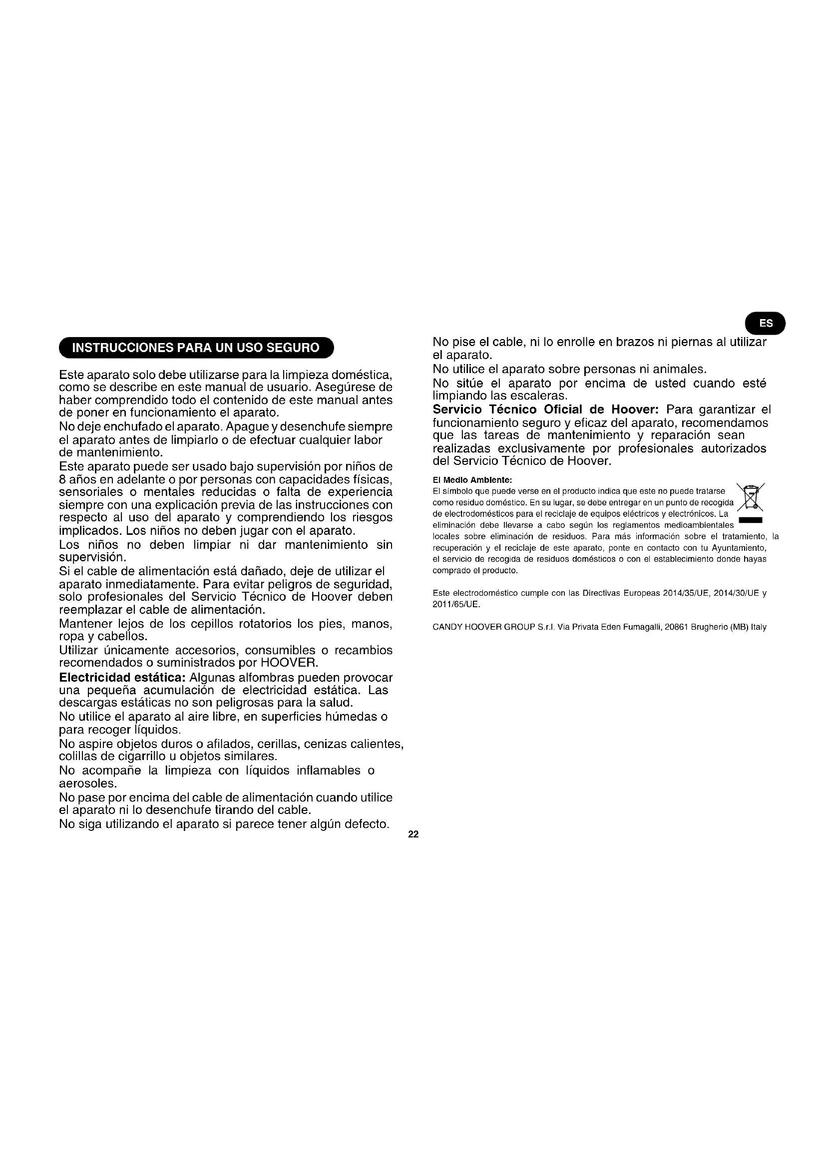 Este aparato solo debe utilizarse para la limpieza doméstica, como se describe en este manual de usuario. Asegúrese de haber comprendido todo el contenido de este manual antes de poner en funcionamiento el aparato. No deje enchufado el aparato. Apague y desenchufe siempre el aparato antes de limpiarlo o de efectuar cualquier labor de mantenimiento. Este aparato puede ser usado bajo supervisión por niños de 8 años en adelante o por personas con capacidades físicas, sensoriales o mentales reducidas o falta de experiencia siempre con una explicación previa de las instrucciones con respecto al uso del aparato y comprendiendo los riesgos implicados. Los niños no deben jugar con el aparato. Los niños no deben limpiar ni dar mantenimiento sin supervisión. Si el cable de alimentación está dañado, deje de utilizar el aparato inmediatamente. Para evitar peligros de seguridad, solo profesionales del Servicio Técnico de Hoover deben reemplazar el cable de alimentación. Mantener lejos de los cepillos rotatorios los pies, manos, ropa y cabellos. Utilizar únicamente accesorios, consumibles o recambios recomendados o suministrados por HOOVER. Electricidad estática: Algunas alfombras pueden provocar una pequeña acumulación de electricidad estática. Las descargas estáticas no son peligrosas para la salud. No utilice el aparato al aire libre, en supercies húmedas o para recoger líquidos. No aspire objetos duros o alados, cerillas, cenizas calientes, colillas de cigarrillo u objetos similares. No acompañe la limpieza con líquidos inamables o aerosoles. No pase por encima del cable de alimentación cuando utilice el aparato ni lo desenchufe tirando del cable. No siga utilizando el aparato si parece tener algún defecto. No pise el cable, ni lo enrolle en brazos ni piernas al utilizar el aparato. No utilice el aparato sobre personas ni animales. No sitúe el aparato por encima de usted cuando esté limpiando las escaleras. Servicio Técnico Ocial de Hoover: Para garantizar el funcionamiento seguro y ecaz del aparato, recomendamos que las tareas de mantenimiento y reparación sean realizadas exclusivamente por profesionales autorizados del Servicio Técnico de Hoover. El Medio Ambiente: El símbolo que puede verse en el producto indica que este no puede tratarse como residuo doméstico. En su lugar, se debe entregar en un punto de recogida de electrodomésticos para el reciclaje de equipos eléctricos y electrónicos. La eliminación debe llevarse a cabo según los reglamentos medioambientales locales sobre eliminación de residuos. Para más información sobre el tratamiento, la recuperación y el reciclaje de este aparato, ponte en contacto con tu Ayuntamiento, el servicio de recogida de residuos domésticos o con el establecimiento donde hayas comprado el producto. Este electrodoméstico cumple con las Directivas Europeas 2014/35/UE, 2014/30/UE y 2011/65/UE. CANDY HOOVER GROUP S.r.l. Via Privata Eden Fumagalli, 20861 Brugherio (MB) Italy23