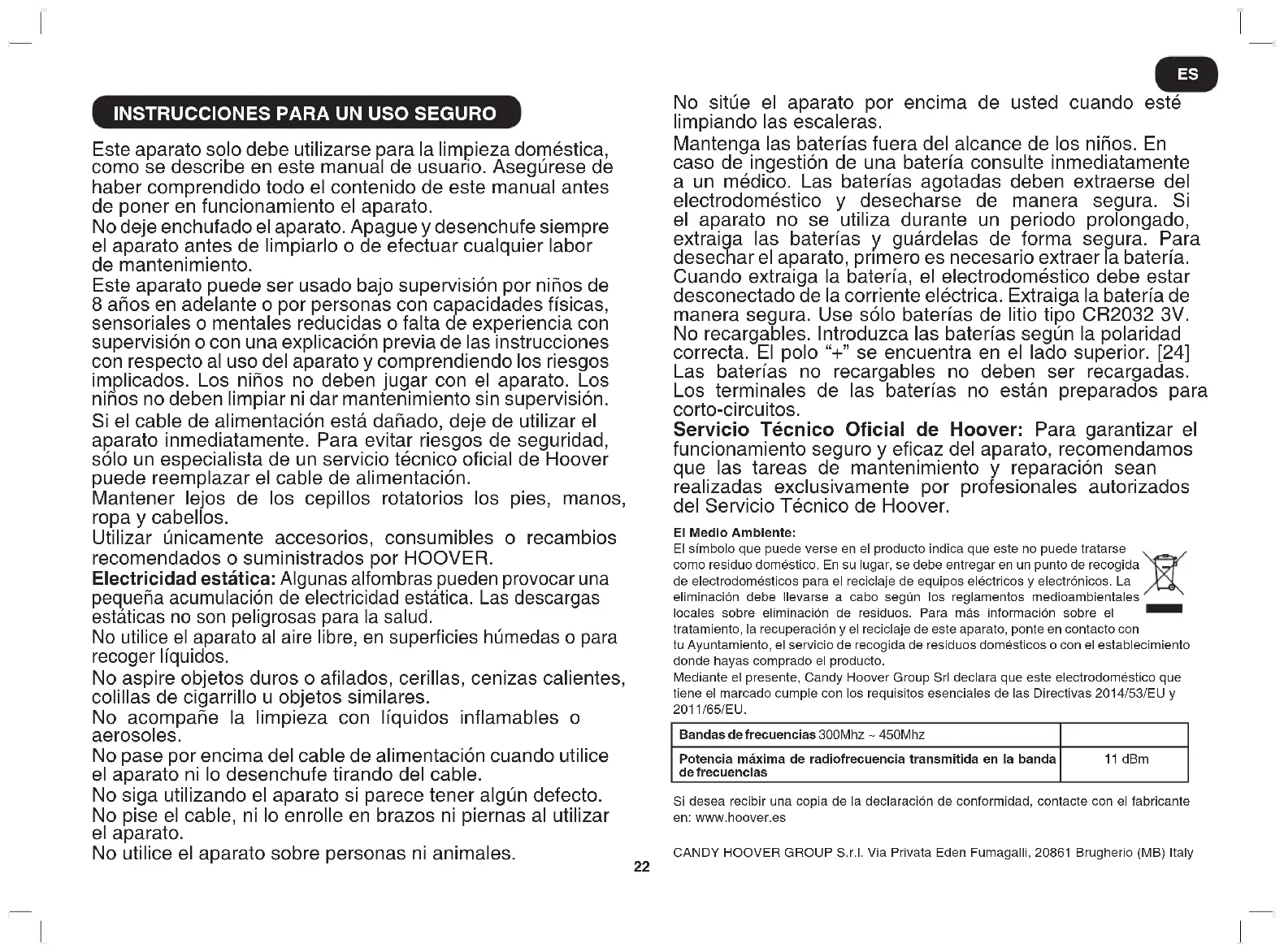 Este aparato solo debe utilizarse para la limpieza doméstica, como se describe en este manual de usuario. Asegúrese de haber comprendido todo el contenido de este manual antes de poner en funcionamiento el aparato. No deje enchufado el aparato. Apague y desenchufe siempre el aparato antes de limpiarlo o de efectuar cualquier labor de mantenimiento. Este aparato puede ser usado bajo supervisión por niños de 8 años en adelante o por personas con capacidades físicas, sensoriales o mentales reducidas o falta de experiencia con supervisión o con una explicación previa de las instrucciones con respecto al uso del aparato y comprendiendo los riesgos implicados. Los niños no deben jugar con el aparato. Los niños no deben limpiar ni dar mantenimiento sin supervisión. Si el cable de alimentación está dañado, deje de utilizar el aparato inmediatamente. Para evitar riesgos de seguridad, sólo un especialista de un servicio técnico ocial de Hoover puede reemplazar el cable de alimentación. Mantener lejos de los cepillos rotatorios los pies, manos, ropa y cabellos. Utilizar únicamente accesorios, consumibles o recambios recomendados o suministrados por HOOVER. Electricidad estática: Algunas alfombras pueden provocar una pequeña acumulación de electricidad estática. Las descargas estáticas no son peligrosas para la salud. No utilice el aparato al aire libre, en supercies húmedas o para recoger líquidos. No aspire objetos duros o alados, cerillas, cenizas calientes, colillas de cigarrillo u objetos similares. No acompañe la limpieza con líquidos inamables o aerosoles. No pase por encima del cable de alimentación cuando utilice el aparato ni lo desenchufe tirando del cable. No siga utilizando el aparato si parece tener algún defecto. No pise el cable, ni lo enrolle en brazos ni piernas al utilizar el aparato. No utilice el aparato sobre personas ni animales. No sitúe el aparato por encima de usted cuando esté limpiando las escaleras. Mantenga las baterías fuera del alcance de los niños. En caso de ingestión de una batería consulte inmediatamente a un médico. Las baterías agotadas deben extraerse del electrodoméstico y desecharse de manera segura. Si el aparato no se utiliza durante un periodo prolongado, extraiga las baterías y guárdelas de forma segura. Para desechar el aparato, primero es necesario extraer la batería. Cuando extraiga la batería, el electrodoméstico debe estar desconectado de la corriente eléctrica. Extraiga la batería de manera segura. Use sólo baterías de litio tipo CR2032 3V. No recargables. Introduzca las baterías según la polaridad correcta. El polo “+” se encuentra en el lado superior. [24] Las baterías no recargables no deben ser recargadas. Los terminales de las baterías no están preparados para corto-circuitos. Servicio Técnico Ocial de Hoover: Para garantizar el funcionamiento seguro y ecaz del aparato, recomendamos que las tareas de mantenimiento y reparación sean realizadas exclusivamente por profesionales autorizados del Servicio Técnico de Hoover. El Medio Ambiente: El símbolo que puede verse en el producto indica que este no puede tratarse como residuo doméstico. En su lugar, se debe entregar en un punto de recogida de electrodomésticos para el reciclaje de equipos eléctricos y electrónicos. La eliminación debe llevarse a cabo según los reglamentos medioambientales locales sobre eliminación de residuos. Para más información sobre el tratamiento, la recuperación y el reciclaje de este aparato, ponte en contacto con tu Ayuntamiento, el servicio de recogida de residuos domésticos o con el establecimiento donde hayas comprado el producto. Mediante el presente, Candy Hoover Group Srl declara que este electrodoméstico que tiene el marcado cumple con los requisitos esenciales de las Directivas 2014/53/EU y 2011/65/EU. Si desea recibir una copia de la declaración de conformidad, contacte con el fabricante en: www.hoover.es CANDY HOOVER GROUP S.r.l. Via Privata Eden Fumagalli, 20861 Brugherio (MB) Italy Bandas de frecuencias 300Mhz ~ 450Mhz Potencia máxima de radiofrecuencia transmitida en la banda de frecuencias 11 dBm23