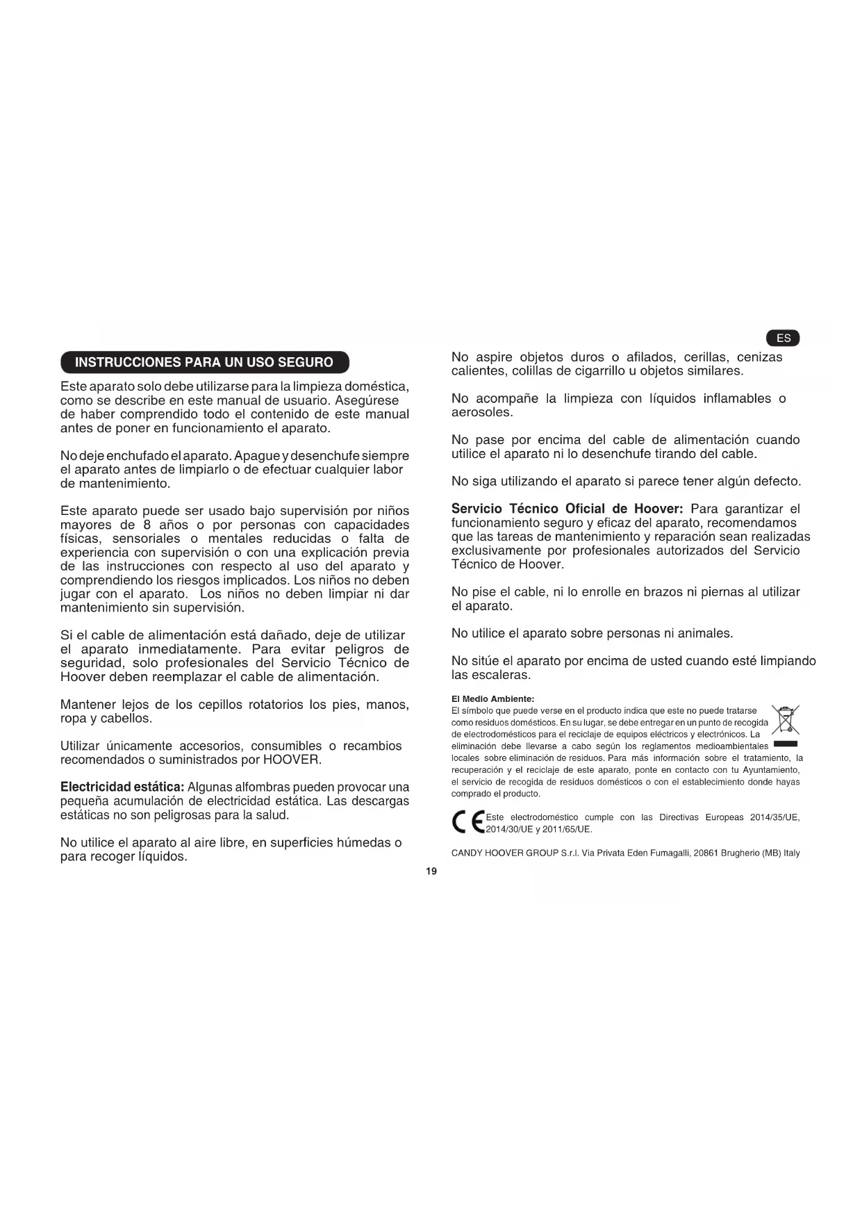 Este aparato solo debe utilizarse para la limpieza doméstica, como se describe en este manual de usuario. Asegúrese de haber comprendido todo el contenido de este manual antes de poner en funcionamiento el aparato. No deje enchufado el aparato. Apague y desenchufe siempre el aparato antes de limpiarlo o de efectuar cualquier labor de mantenimiento. Este aparato puede ser usado bajo supervisión por niños mayores de 8 años o por personas con capacidades físicas, sensoriales o mentales reducidas o falta de experiencia con supervisión o con una explicación previa de las instrucciones con respecto al uso del aparato y comprendiendo los riesgos implicados. Los niños no deben jugar con el aparato. Los niños no deben limpiar ni dar mantenimiento sin supervisión. Si el cable de alimentación está dañado, deje de utilizar el aparato inmediatamente. Para evitar peligros de seguridad, solo profesionales del Servicio Técnico de Hoover deben reemplazar el cable de alimentación. Mantener lejos de los cepillos rotatorios los pies, manos, ropa y cabellos. Utilizar únicamente accesorios, consumibles o recambios recomendados o suministrados por HOOVER. Electricidad estática: Algunas alfombras pueden provocar una pequeña acumulación de electricidad estática. Las descargas estáticas no son peligrosas para la salud. No utilice el aparato al aire libre, en supercies húmedas o para recoger líquidos. No aspire objetos duros o alados, cerillas, cenizas calientes, colillas de cigarrillo u objetos similares. No acompañe la limpieza con líquidos inamables o aerosoles. No pase por encima del cable de alimentación cuando utilice el aparato ni lo desenchufe tirando del cable. No siga utilizando el aparato si parece tener algún defecto. Servicio Técnico Ocial de Hoover: Para garantizar el funcionamiento seguro y ecaz del aparato, recomendamos que las tareas de mantenimiento y reparación sean realizadas exclusivamente por profesionales autorizados del Servicio Técnico de Hoover. No pise el cable, ni lo enrolle en brazos ni piernas al utilizar el aparato. No utilice el aparato sobre personas ni animales. No sitúe el aparato por encima de usted cuando esté limpiando las escaleras. El Medio Ambiente: El símbolo que puede verse en el producto indica que este no puede tratarse como residuos domésticos. En su lugar, se debe entregar en un punto de recogida de electrodomésticos para el reciclaje de equipos eléctricos y electrónicos. La eliminación debe llevarse a cabo según los reglamentos medioambientales locales sobre eliminación de residuos. Para más información sobre el tratamiento, la recuperación y el reciclaje de este aparato, ponte en contacto con tu Ayuntamiento, el servicio de recogida de residuos domésticos o con el establecimiento donde hayas comprado el producto. Este electrodoméstico cumple con las Directivas Europeas 2014/35/UE, 2014/30/UE y 2011/65/UE. CANDY HOOVER GROUP S.r.l. Via Privata Eden Fumagalli, 20861 Brugherio (MB) Italy ES20 *Disponible solo en algunos modelos **El diseño del cepillo puede variar según el modelo