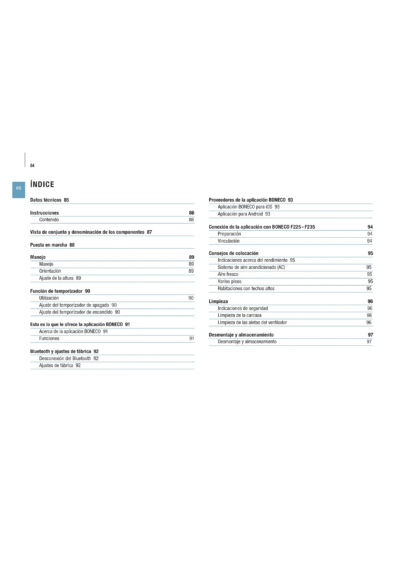 ÍNDICE Datos técnicos 85 Instrucciones 86 Contenido 86 Vista de conjunto y denominación de los componentes 87 Puesta en marcha 88 Manejo 89 Manejo 89 Orientación 89 Ajuste de la altura 89 Función de temporizador 90 Utilización 90 Ajuste del temporizador de apagado 90 Ajuste del temporizador de encendido 90 Esto es lo que le ofrece la aplicación BONECO 91 Acerca de la aplicación BONECO 91 Funciones 91 Bluetooth y ajustes de fábrica 92 Desconexión del Bluetooth 92 Ajustes de fábrica 92 Proveedores de la aplicación BONECO 93 Aplicación BONECO para iOS 93 Aplicación para Android 93 Conexión de la aplicación con BONECO F225 – F235 94 Preparación 94 Vinculación 94 Consejos de colocación 95 Indicaciones acerca del rendimiento 95 Sistema de aire acondicionado (AC) 95 Aire fresco 95 Varios pisos 95 Habitaciones con techos altos 95 Limpieza 96 Indicaciones de seguridad 96 Limpieza de la carcasa 96 Limpieza de las aletas del ventilador 96 Desmontaje y almacenamiento 97 Desmontaje y almacenamiento 9785