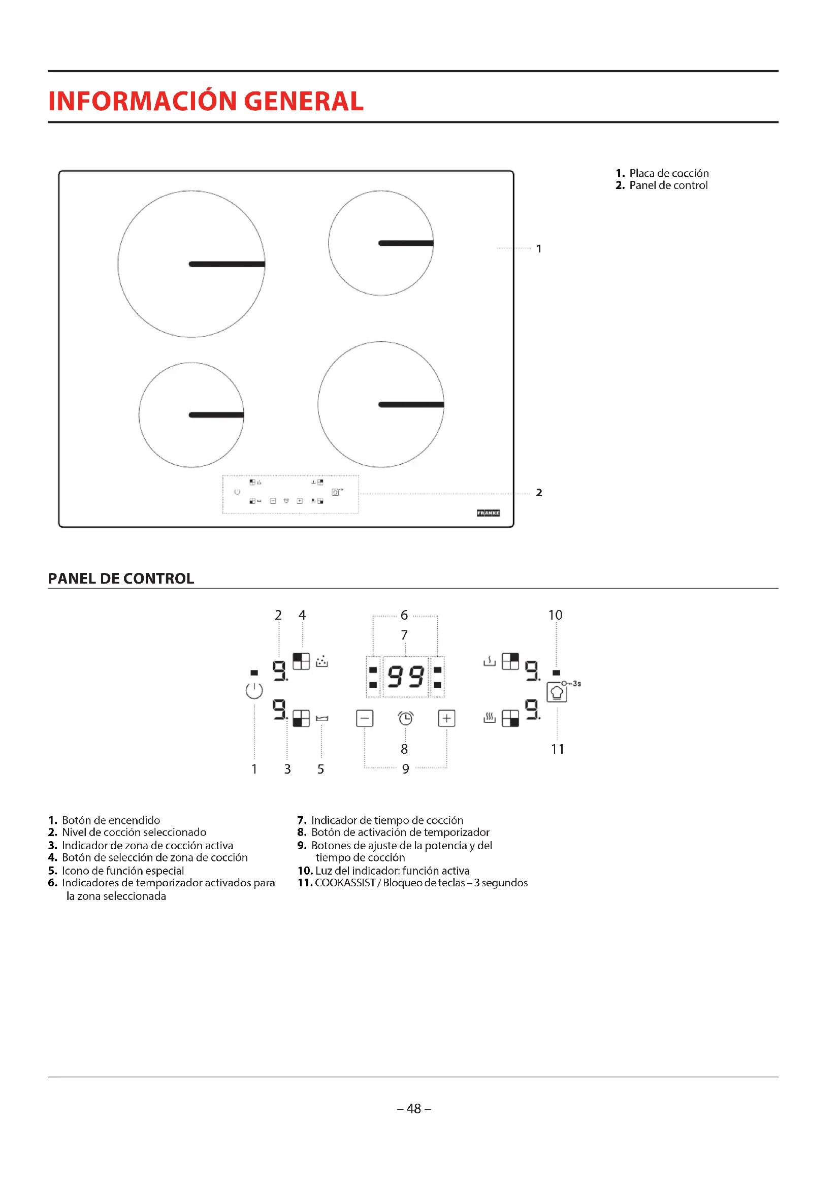 1. Botón de encendido2. Nivel de cocción seleccionado3. Indicador de zona de cocción activa4. Botón de selección de zona de cocción5. Icono de función especial6. Indicadores de temporizador activados para la zona seleccionada7. Indicador de tiempo de cocción8. Botón de activación de temporizador9. Botones de ajuste de la potencia y del tiempo de cocción10. Luz del indicador: función activa11. COOKASSIST / Bloqueo de teclas – 3 segundos – 48 –ACCESORIOS PRIMER USO POWER MANAGEMENT ( GESTIÓN DE POTENCIA) En el momento de la compra, la placa está ajustada en la máxima potencia posible. Ajuste la conguración de acuerdo con las limitaciones del sistema eléctrico de su hogar según se describe en el párrafo siguiente. Nota: En función de la potencia seleccionada para la placa, es posible que se limiten automáticamente algunos niveles de potencia y funciones de la zona de cocción (p. ej. ebullición o recalentamiento automático). Esto es así para evitar que se supere el límite seleccionado. Para congurar la potencia de la placa: Una vez conectado el aparato a la red eléctrica, puede congurar el nivel de potencia durante los siguientes 60 segundos. Mantenga pulsado el botón “+“ durante al menos 3 segundos. En la pantalla se mostrará el símbolo “PL“. Pulse el botón