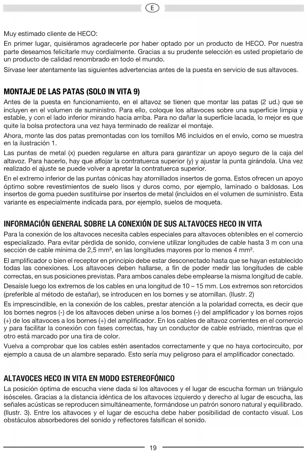 Configurazione: bassreflex 3 vie bassreflex 2 vie Potenza max.: 240 / 380 Watt 90 / 160 Watt Impedenza: 4 – 8 Ohm 4 – 8 Ohm Gamma di frequenze: 23 – 43 000 Hz 30 – 43 000 Hz Potenza amplificatore consigliata: 30 – 380 Watt 20 – 160 Watt Rendimento (2.8V/1m): 92 dB 90 dB Dimensioni (largh x alt x prof): 290 x 1150 x 393 mm 205 x 1120 x 375 mm (Solo l’alloggiamento) 205 x 377 x 333 mm 205 x 377 x 315 mm (Solo l’alloggiamento) Accessori: Punte in gomma dura Punte in gomma dura Punte in metallo CON RISERVA DI APPORTARE MODIFICHE TECNICHE. 18Muy estimado cliente de HECO: En primer lugar, quisiéramos agradecerle por haber optado por un producto de HECO. Por nuestra parte deseamos felicitarle muy cordialmente. Gracias a su prudente selección es usted propietario de un producto de calidad renombrado en todo el mundo. Sírvase leer atentamente las siguientes advertencias antes de la puesta en servicio de sus altavoces. MONTAJE DE LAS PATAS (SOLO IN VITA 9) Antes de la puesta en funcionamiento, en el altavoz se tienen que montar las patas (2 ud.) que se incluyen en el volumen de suministro. Para ello, coloque los altavoces sobre una superficie limpia y estable, y con el lado inferior mirando hacia arriba. Para no dañar la superficie lacada, lo mejor es que quite la bolsa protectora una vez haya terminado de realizar el montaje. Ahora, monte las dos patas premontadas con los tornillos M6 incluidos en el envío, como se muestra en la ilustración 1. Las puntas de metal (x) pueden regularse en altura para garantizar un apoyo seguro de la caja del altavoz. Para hacerlo, hay que aflojar la contratuerca superior (y) y ajustar la punta girándola. Una vez realizado el ajuste se puede volver a apretar la contratuerca superior. En el extremo inferior de las puntas cónicas hay atornillados insertos de goma. Estos ofrecen un apoyo óptimo sobre revestimientos de suelo lisos y duros como, por ejemplo, laminado o baldosas. Los insertos de goma pueden sustituirse por insertos de metal (incluidos en el volumen de suministro. Esta variante es especialmente indicada para, por ejemplo, suelos de moqueta. INFORMACIÓN GENERAL SOBRE LA CONEXIÓN DE SUS ALTAVOCES HECO IN VITA Para la conexión de los altavoces necesita cables especiales para altavoces obtenibles en el comercio especializado. Para evitar pérdida de sonido, conviene utilizar longitudes de cable hasta 3 m con una sección de cable mínima de 2,5 mm², en las longitudes mayores por lo menos 4 mm². El amplificador o bien el receptor en principio debe estar desconectado hasta que se hayan establecido todas las conexiones. Los altavoces deben hallarse, a fin de poder medir las longitudes de cable correctas, en sus posiciones previstas. Para ambos canales debe emplearse la misma longitud de cable. Desaísle luego los extremos de los cables en una longitud de 10 – 15 mm. Los extremos son retorcidos (preferible al método de estañar), se introducen en los bornes y se atornillan. (Ilustr. 2) Es imprescindible, en la conexión de los cables, prestar atención a la polaridad correcta, es decir que los bornes negros (-) de los altavoces deben unirse a los bornes (-) del amplificador y los bornes rojos (+) de los altavoces a los bornes (+) del amplificador. En los cables de altavoz corrientes en el comercio y para facilitar la conexión con fases correctas, hay un conductor de cable estriado, mientras que el otro está marcado por una tira de color. Vuelva a comprobar que los cables estén asentados correctamente y que no haya cortocircuito, por ejemplo a causa de un alambre separado. Esto sería muy peligroso para el amplificador conectado. ALTAVOCES HECO IN VITA EN MODO ESTEREOFÓNICO La posición óptima de escucha viene dada si los altavoces y el lugar de escucha forman un triángulo isósceles. Gracias a la distancia idéntica de los altavoces izquierdo y derecho al lugar de escucha, las señales acústicas se reproducen simultáneamente, formándose un patrón sonoro natural y equilibrado. (Ilustr. 3). Entre los altavoces y el lugar de escucha debe haber posibilidad de contacto visual. Los obstáculos absorbedores del sonido y reflectores falsifican el sonido. 19Además, en el emplazamiento de los altavoces deben respetarse las siguientes distancias: Altavoz de pie: a la pared trasera un mínimo de 20 cm, a la pared lateral un mínimo de 30 cm. Con ello se evita una reproducción exagerada de los bajos. Altavoz de estante: También los altavoces de estantes deben colocarse de tal manera que queden espacios libres amplios; la distancia mínima lateral y trasera a la pared deberá ser de 10 cm, y los altavoces de sonidos agudos deberán estar al nivel de las oídos. Puntas (altavoz de pie): En el emplazamiento conviene utilizar las puntas suministradas. Con éstas, los altavoces son desacoplados de su base, lo que impide la aparición de resonancias indeseables. En los altavoces de pie puede optar entre puntas de metal o de caucho endurecido. Las puntas se enroscan en los casquillos ubicados en la cara inferior de los altavoces. ALTAVOCES HECO IN VITA COMO ALTAVOZ FRONTAL O TRASERO Los altavoces frontales deberán colocarse a la derecha e izquierda de la televisión, a ser posible a la misma distancia de la misma y a la altura de los oídos. Los altavoces traseros deberán colocarse a la derecha e izquierda al lado o si es posible detrás del lugar de audición a la altura de los oídos o una altura algo superior. (Ilustr. 4) EL PANEL DE CONEXIONES DEL ALTAVOZ HECO IN VITA / BI-WIRING Y BI-AMPING Los paneles de conexiones de los altavoces In Vita incluyen cinco terminales roscados que, además de la conexión convencional a un amplificador, permiten efectuar conexiones bi-wiring y bi-amping. Los terminales superiores están conectados a la derivación de los tonos agudos y/o agudos medios del divisor de frecuencias y los terminales inferiores, a la de los tonos graves. Por medio de un terminal adicional es posible elevar unos 2 dB los to