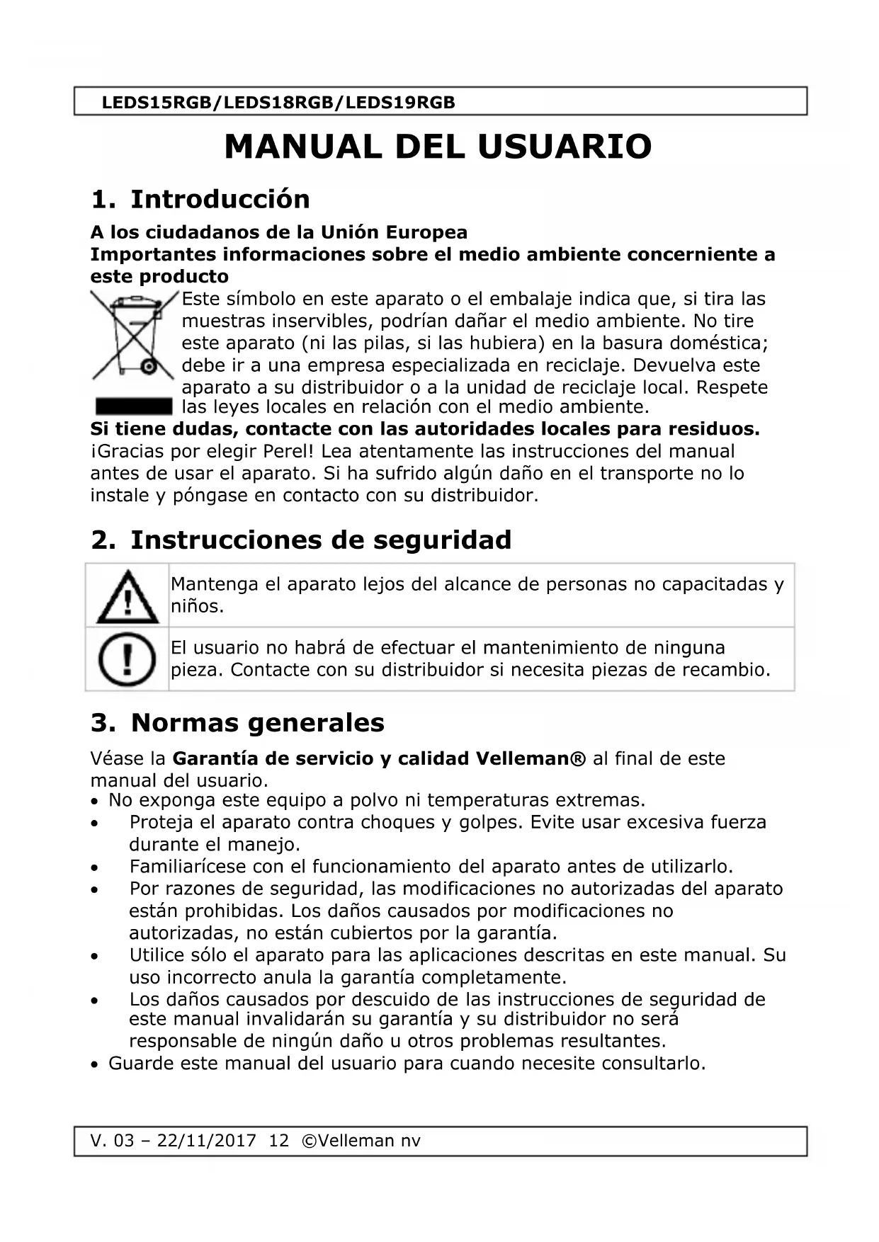 Véase la Garantía de servicio y calidad Velleman® al final de este manual del usuario. No exponga este equipo a polvo ni temperaturas extremas. Proteja el aparato contra choques y golpes. Evite usar excesiva fuerza durante el manejo. Familiarícese con el funcionamiento del aparato antes de utilizarlo. Por razones de seguridad, las modificaciones no autorizadas del aparato están prohibidas. Los daños causados por modificaciones no autorizadas, no están cubiertos por la garantía. Utilice sólo el aparato para las aplicaciones descritas en este manual. Su uso incorrecto anula la garantía completamente. Los daños causados por descuido de las instrucciones de seguridad de este manual invalidarán su garantía y su distribuidor no será responsable de ningún daño u otros problemas resultantes. Guarde este manual del usuario para cuando necesite consultarlo.LEDS15RGB/LEDS18RGB/LEDS19RGB