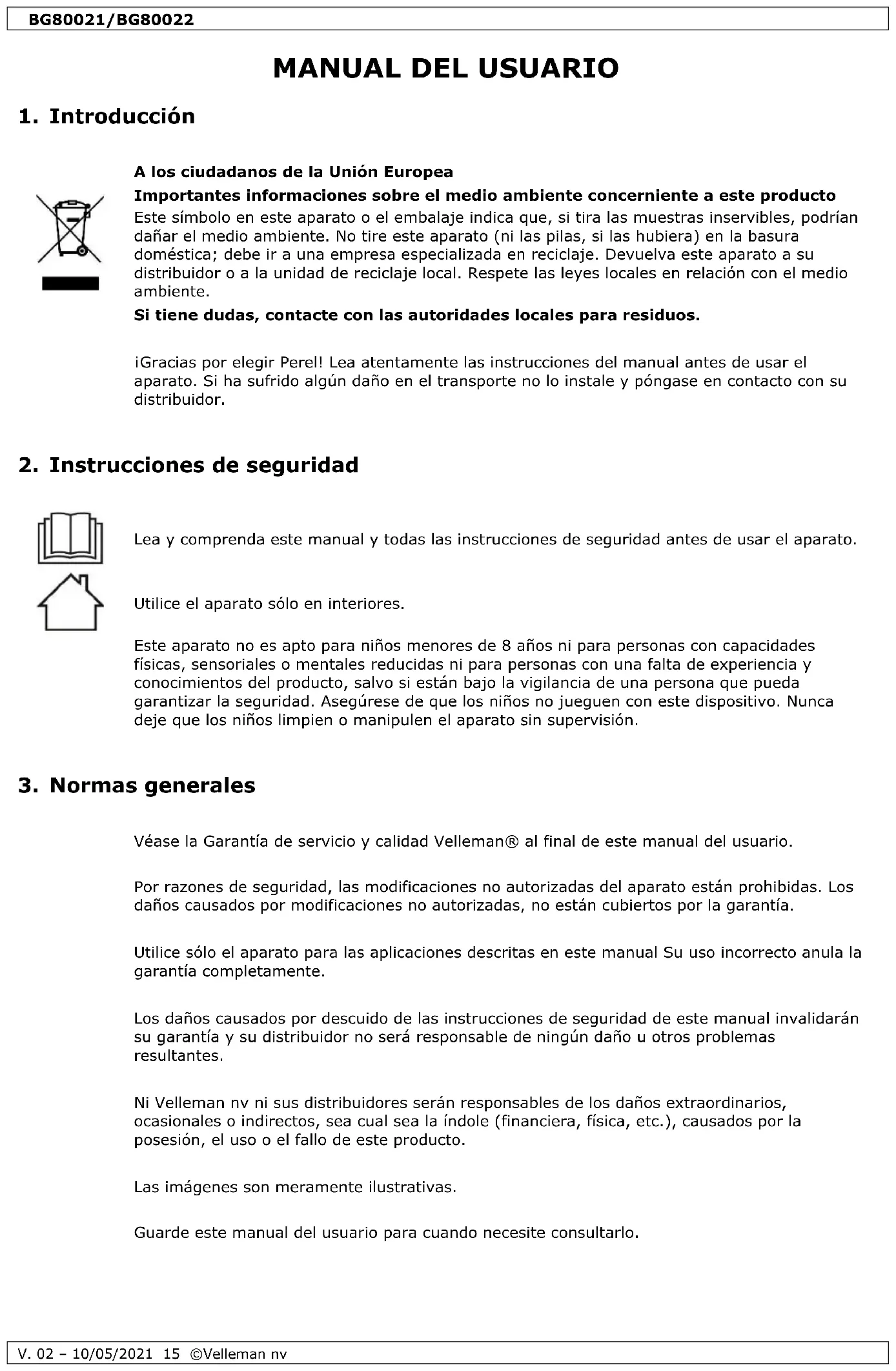 Velleman NV dispone de los derechos de autor para este manual del usuario. Todos los derechos mundiales reservados. Está estrictamente prohibido reproducir, traducir, copiar, editar y guardar este manual del usuario o partes de ello sin el consentimiento previo por escrito del propietario del copyright.BG80021/BG80022