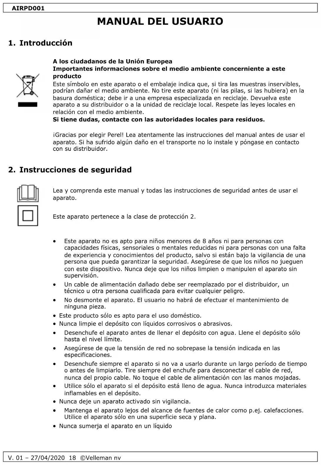 Velleman NV dispone de los derechos de autor para este manual del usuario. Todos los derechos mundiales reservados. Está estrictamente prohibido reproducir, traducir, copiar, editar y guardar este manual del usuario o partes de ello sin el consentimiento previo por escrito del propietario del copyright.AIRPD001