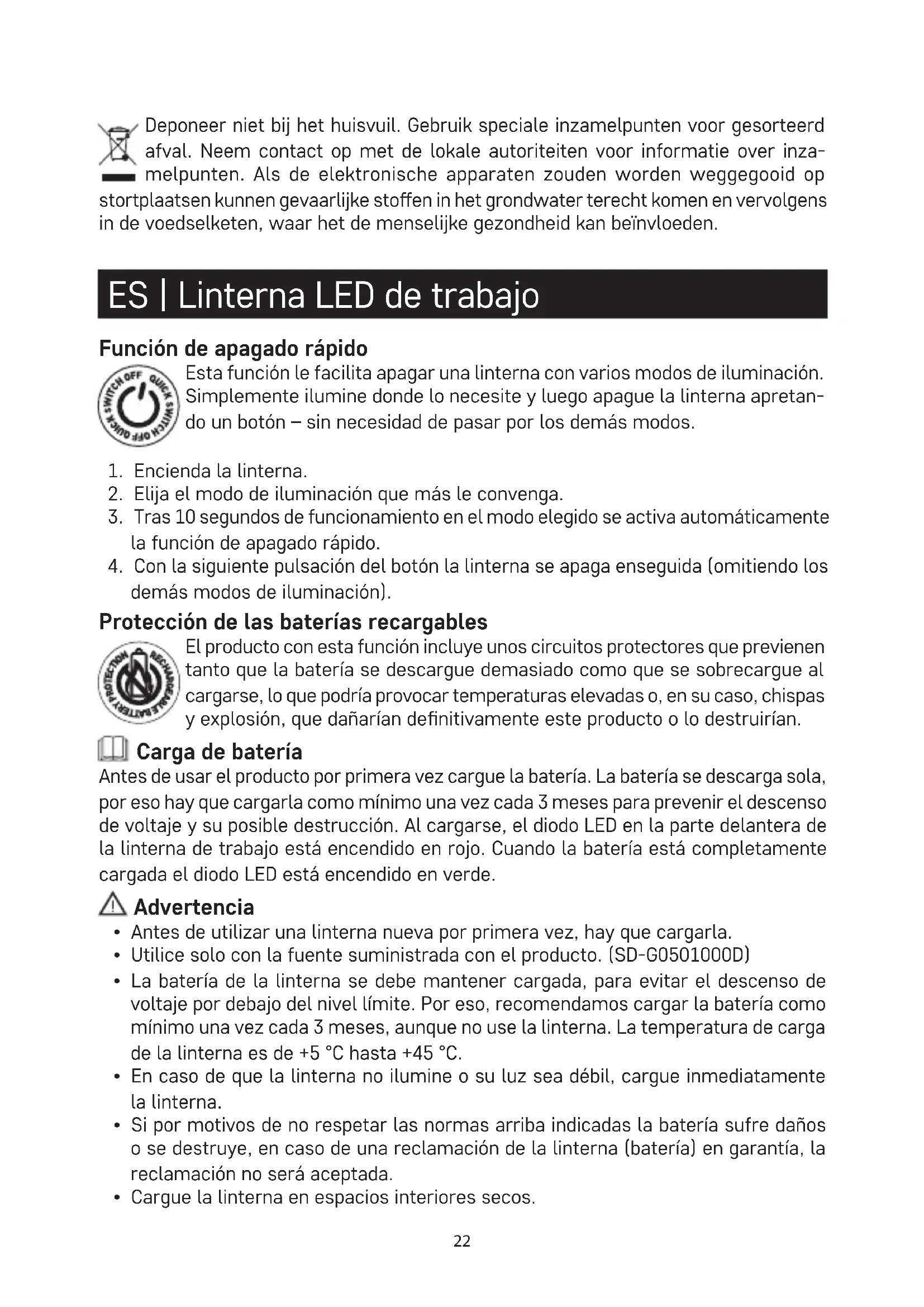 demás modos de iluminación). Protección de las baterías recargables El producto con esta función incluye unos circuitos protectores que previenen tanto que la batería se descargue demasiado como que se sobrecargue al cargarse, lo que podría provocar temperaturas elevadas o, en su caso, chispas y explosión, que dañarían denitivamente este producto o lo destruirían. Carga de batería Antes de usar el producto por primera vez cargue la batería. La batería se descarga sola, por eso hay que cargarla como mínimo una vez cada 3 meses para prevenir el descenso de voltaje y su posible destrucción. Al cargarse, el diodo LED en la parte delantera de la linterna de trabajo está encendido en rojo. Cuando la batería está completamente cargada el diodo LED está encendido en verde. Advertencia