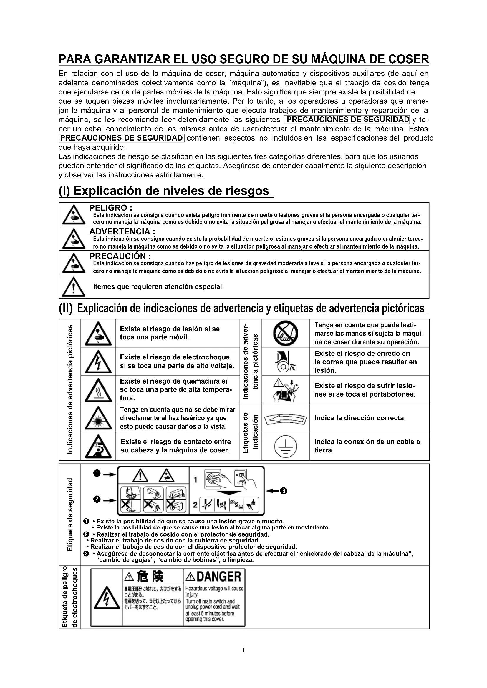 PARA GARANTIZAR EL USO SEGURO DE SU MÁQUINA DE COSER (I) Explicación de niveles de riesgos (II) Explicación de indicaciones de advertencia y etiquetas de advertencia pictóricasii