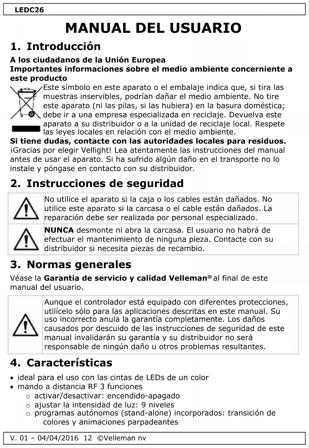 Velleman NV dispone de los derechos de autor para este manual del usuario. Todos los derechos mundiales reservados. Está estrictamente prohibido reproducir, traducir, copiar, editar y guardar este manual del usuario o partes de ello sin el consentimiento previo por escrito del propietario del copyright.LEDC26