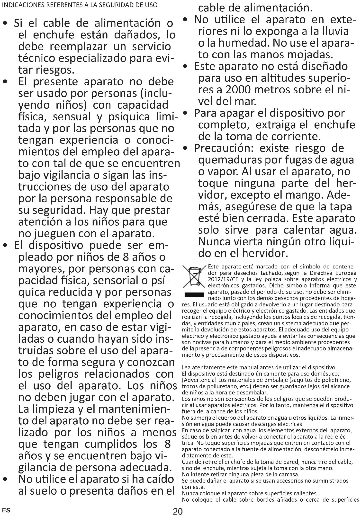 - Precaución: existe riesgo de quemaduras por fugas de agua o vapor. Al usar el aparato, no toque ninguna parte del her- vidor, excepto el mango. Ade- más, asegúrese de que la tapa esté bien cerrada. Este aparato solo sirve para calentar agua. Nunca vierta ningún otro líqui- do en el hervidor. Este aparato está marcado con el símbolo de contene- dor para desechos tachado, según la Direcva Europea 2012/19/CE y la ley polaca sobre aparatos eléctricos y electrónicos gastados. Dicho símbolo informa que este aparato, pasado el periodo de su uso, no debe ser elimi- nado junto con los demás desechos procedentes de hoga- res. El usuario está obligado a devolverlo a un lugar desnado para recoger el equipo eléctrico y electrónico gastado. Las endades que realizan la recogida, incluyendo los puntos locales de recogida, en- das, y endades municipales, crean un sistema adecuado que per- mite la devolución de estos aparatos. El adecuado uso del equipo eléctrico y electrónico gastado ayuda a evitar las consecuencias que son nocivas para humanos y para el medio ambiente procedentes de la presencia de componentes peligrosos e inadecuado almacena- miento y procesamiento de estos disposivos. Lea atentamente este manual antes de ulizar el disposivo. El disposivo está desnado únicamente para uso domésco. ¡Advertencia! Los materiales de embalaje (saquitos de polieleno, trozos de poliuretano, etc.) deben ser guardados lejos del alcance de niños a la hora de desembalar. Los niños no son conscientes de los peligros que se pueden produ- cir al usar aparatos eléctricos. Por lo tanto, mantenga el disposivo fuera del alcance de los niños. No sumerja el cuerpo del aparato en agua u otros líquidos. La inmer- sión en agua puede causar descargas eléctricas. En caso de salpicar con agua los elementos externos del aparato, séquelos bien antes de volver a conectar el aparato a la red eléc- trica. No toque supercies mojadas que entren en contacto con el aparato conectado a la fuente de alimentación, desconéctelo inme- diatamente de este. Cuando rere el enchufe de la toma de pared, nunca re del cable, sino del enchufe, mientras sujeta la toma con la otra mano. No intente rerar ninguna pieza de la carcasa. Se puede dañar el aparato si se usan accesorios no suministrados con este. Nunca coloque el aparato sobre supercies calientes. No coloque el cable sobre bordes alados o cerca de supercies21