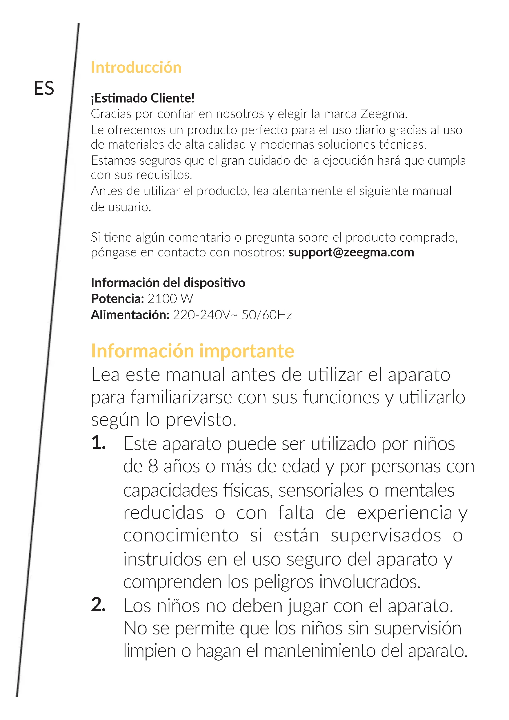 - Après chaque ulisaon de l’appareil, rerez et videz le bac de récupéraon (9, g. A). Lavez le bac à l’eau chaude en ulisant un détergent non agressif, puis séchez-le avec un chion doux. Les photos ne sont présentées qu’à tre d’illustraon. L’aspect réel des produits peut diérer de celui des images.ES Introducción ¡Esmado Cliente! Gracias por conar en nosotros y elegir la marca Zeegma. Le ofrecemos un producto perfecto para el uso diario gracias al uso de materiales de alta calidad y modernas soluciones técnicas. Estamos seguros que el gran cuidado de la ejecución hará que cumpla con sus requisitos. Antes de ulizar el producto, lea atentamente el siguiente manual de usuario. Si ene algún comentario o pregunta sobre el producto comprado, póngase en contacto con nosotros: support@zeegma.com Información del disposivo Potencia: 2100 W Alimentación: 220-240V~ 50/60Hz Información importante Lea este manual antes de ulizar el aparato para familiarizarse con sus funciones y ulizarlo según lo previsto.