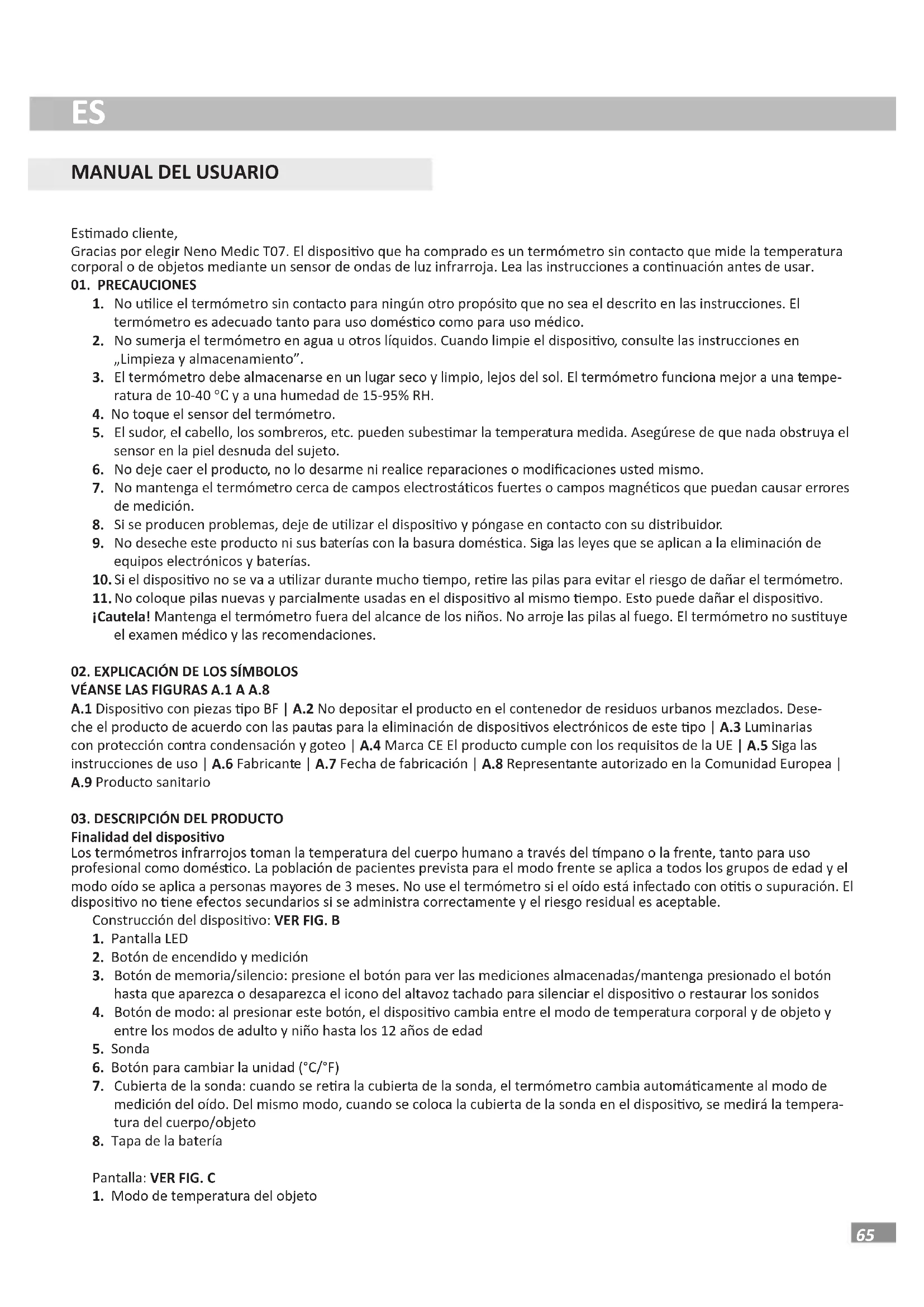 Finalidad del disposivo Lostermómetrosinfrarrojostomanlatemperaturadelcuerpohumanoatravésdelmpanoolafrente,tantoparauso profesionalcomodomésco.Lapoblacióndepacientesprevistaparaelmodofrenteseaplicaatodoslosgruposdeedadyel modooídoseaplicaapersonasmayoresde3meses.Nouseeltermómetrosieloídoestáinfectadoconososupuración.El disposivonoeneefectossecundariossiseadministracorrectamenteyelriesgoresidualesaceptable. Construccióndeldisposivo:VER FIG. B